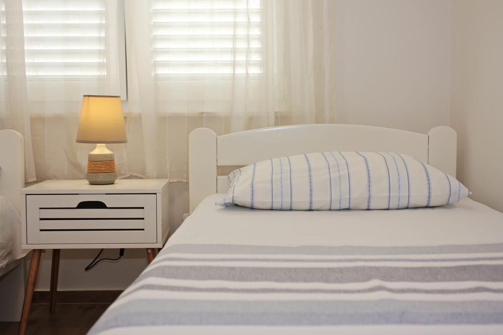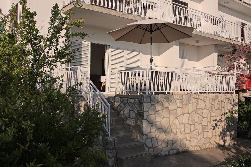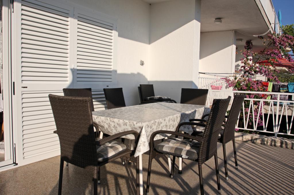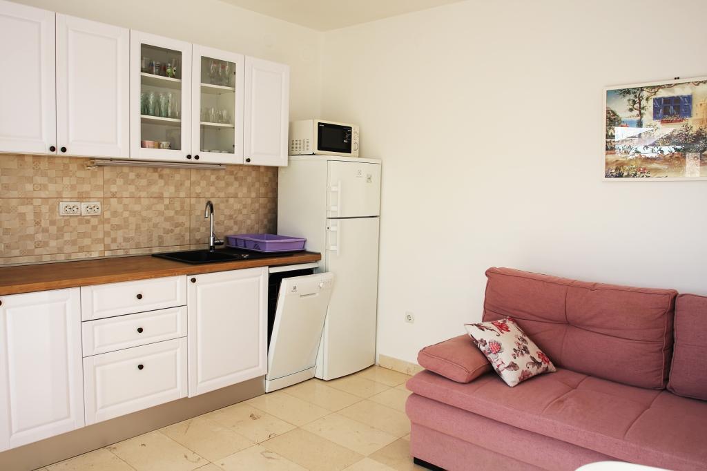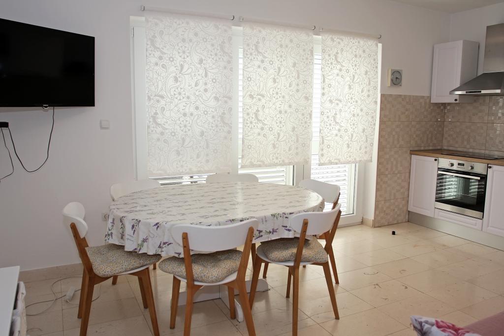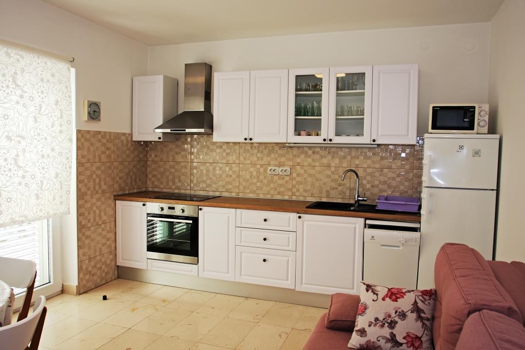Nowo wybudowany trzypokojowy apartament na parterze, pierwszy rząd do morza. Mieszkanie składa się z kuchni z jadalnią i salonem, trzech sypialni, dwóch łazienek z toaletami, innej oddzielnej toalety, posiada również duży taras i inny balkon. Dwie sypialnie mają podwójne łóżka, a jedna ma dwa oddzielne łóżka. W salonie znajduje się trzyosobowy pokój, który rozciąga się na łóżko dla dwóch osób. Kuchnia wyposażona jest w zmywarkę, kuchenkę mikrofalową, piekarnik, lodówkę z zamrażarką. Jedna łazienka ma pralkę. Na dziedzińcu znajdują się dwa miejsca parkingowe, a goście mają sprzęt do grillowania. Plaża znajduje się tuż przed domem.