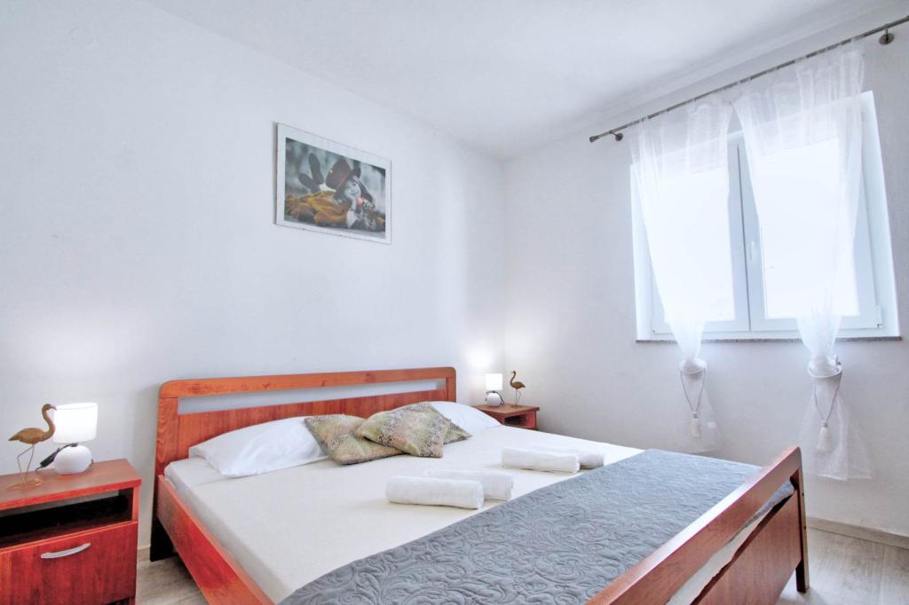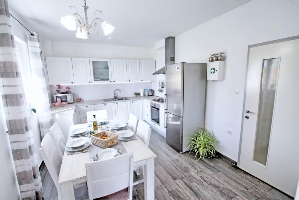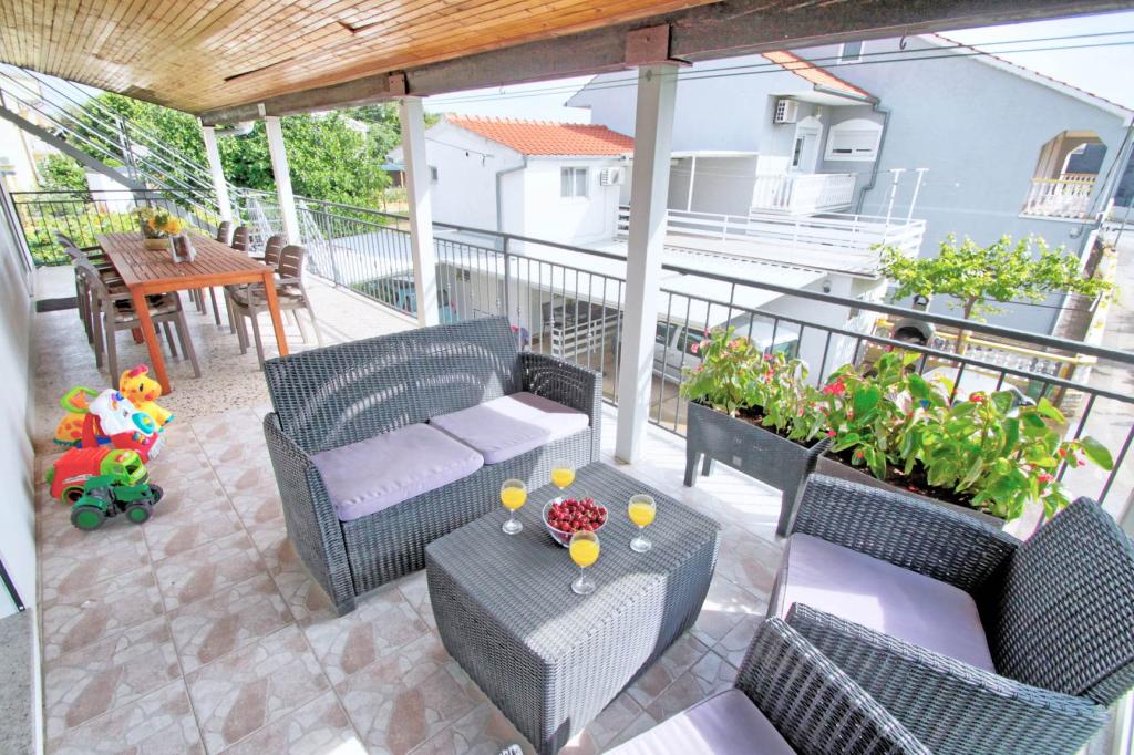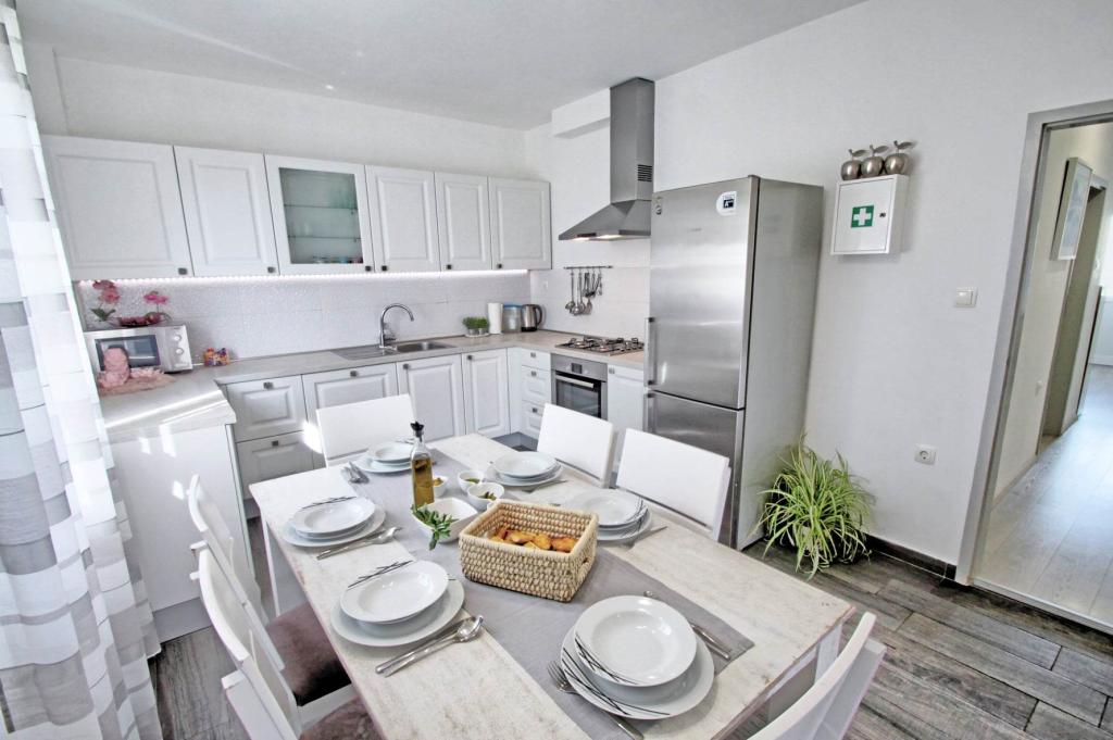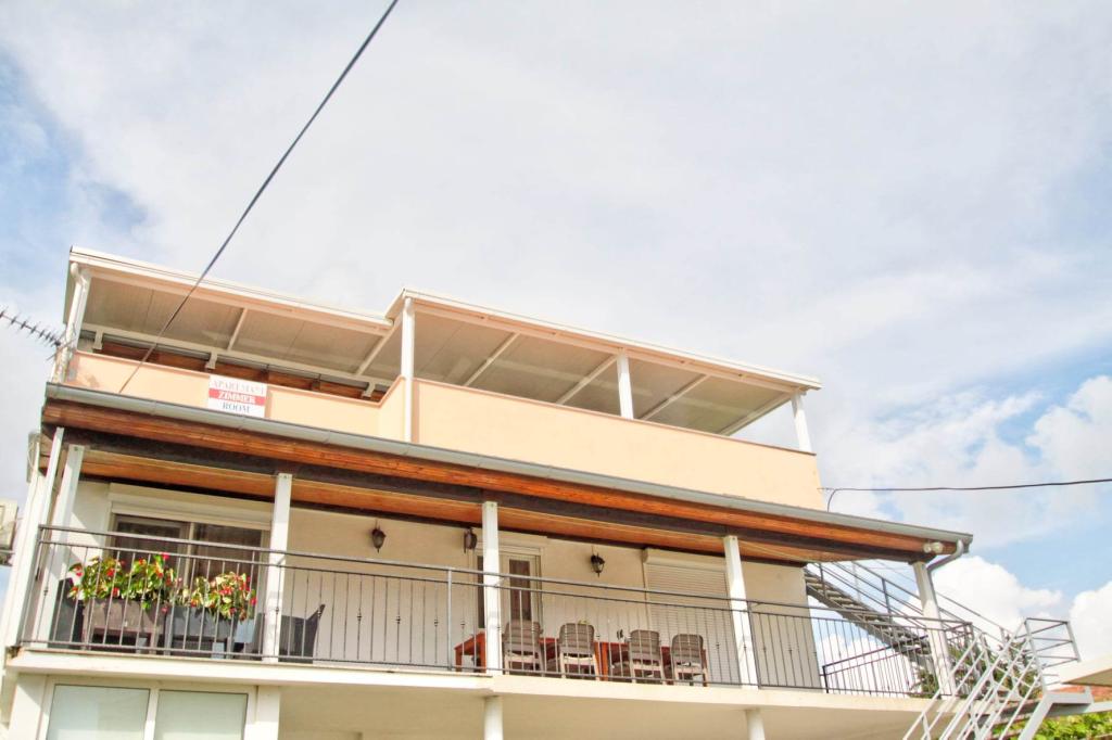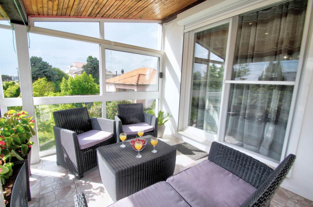 W pełni wyposażony apartament na 1 piętrze dla 6+2 osób. Oddzielne wejście. Duży, oddzielny i zadaszony taras z bezpośrednim widokiem na morze. Mieszkanie ma 3 sypialnie, 2 toalety, z których jedna jest połączona z sypialnią. Plaża znajduje się 40 m od apartamentu, ma naturalny cień i piaszczyste boisko do siatkówki. Centrum oddalone jest o 300 m, a wszystko inne w promieniu 100 m.