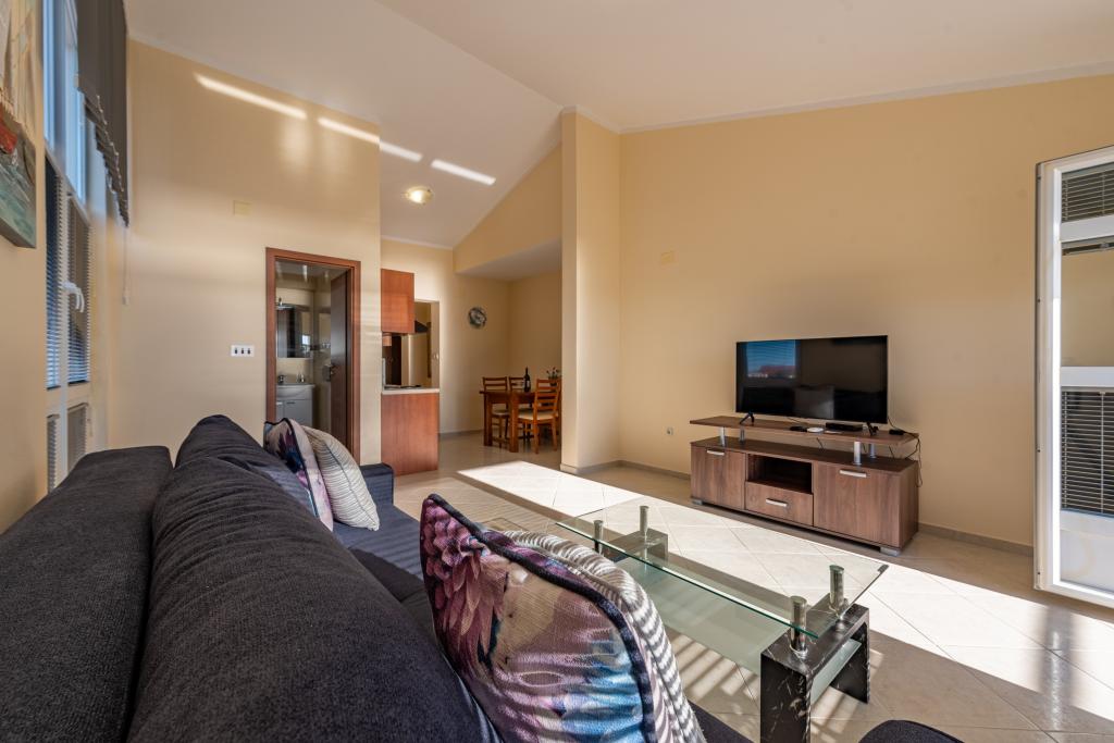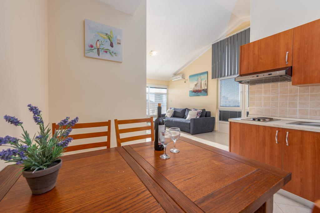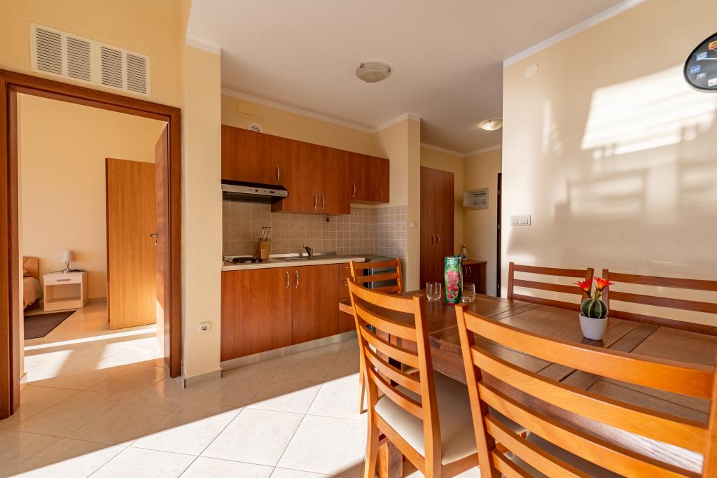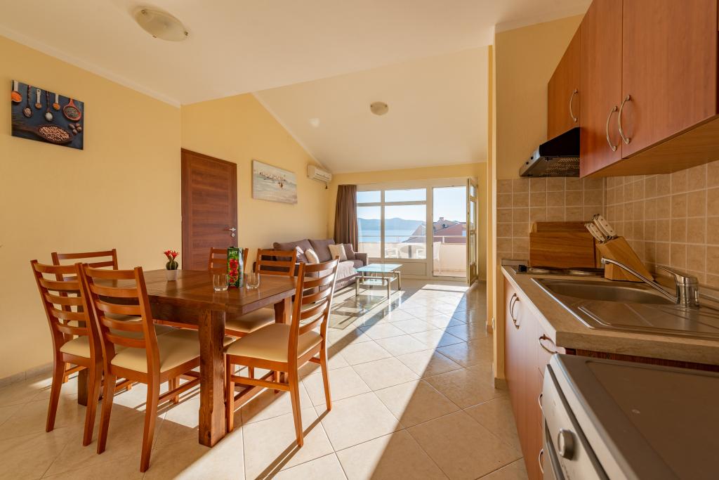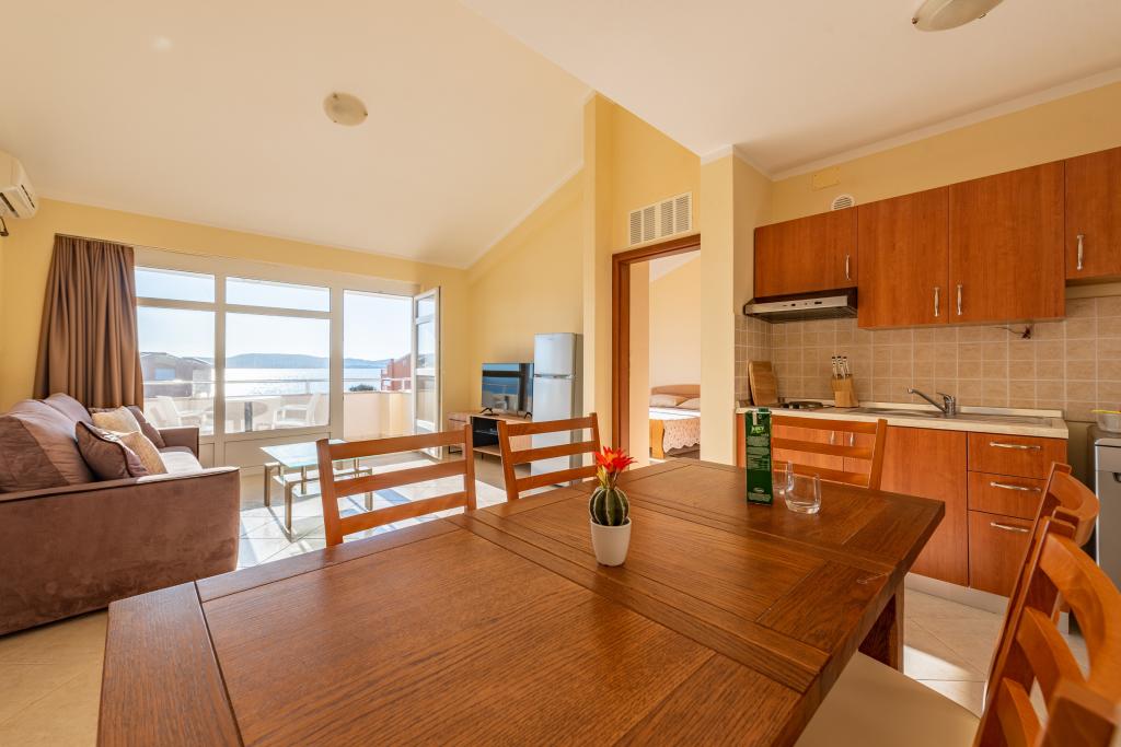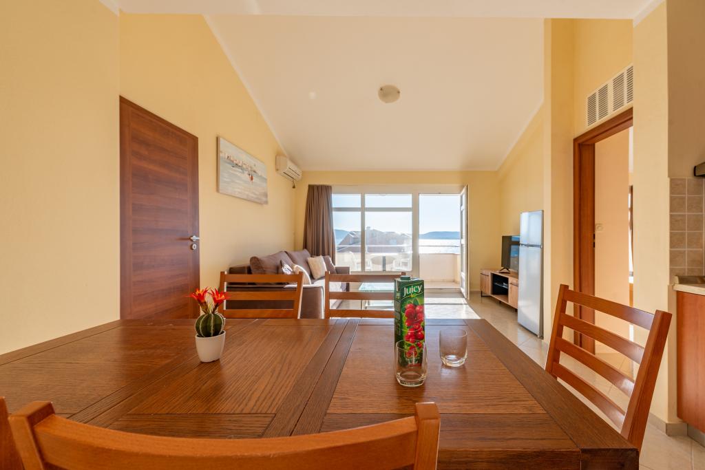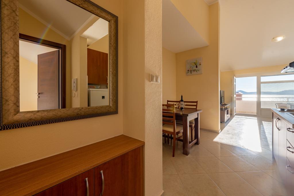 Mieszkanie jest dobrze wyposażone i posiada dwa balkony z pięknym widokiem na morze. Klimatyzacja pozwala dostosować temperaturę w pomieszczeniu w zależności od pogody. Lokalizacja idealna dla rodzin z dziećmi, niemal bezpośrednio przy plaży, a mimo to cicho. W pobliżu znajduje się plaża dla dzieci z piaszczystym dnem. Personel jest przyjazny i pomocny.