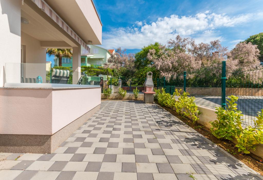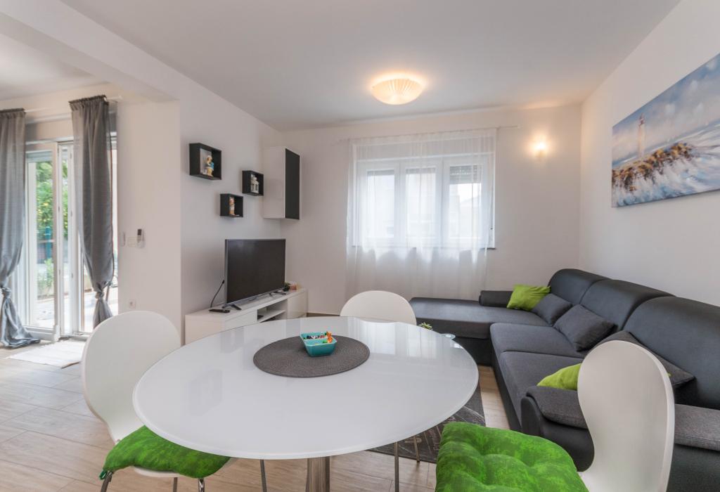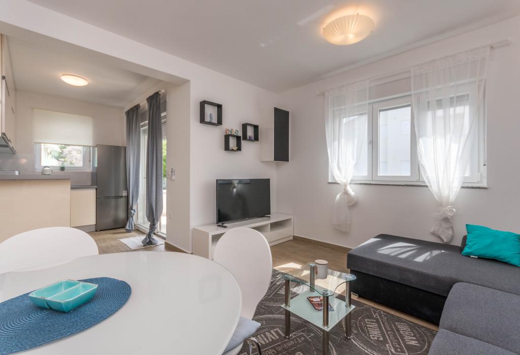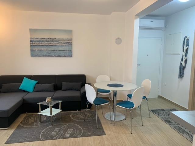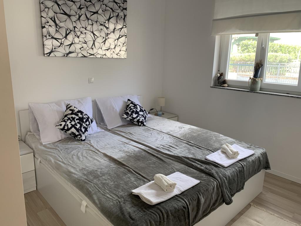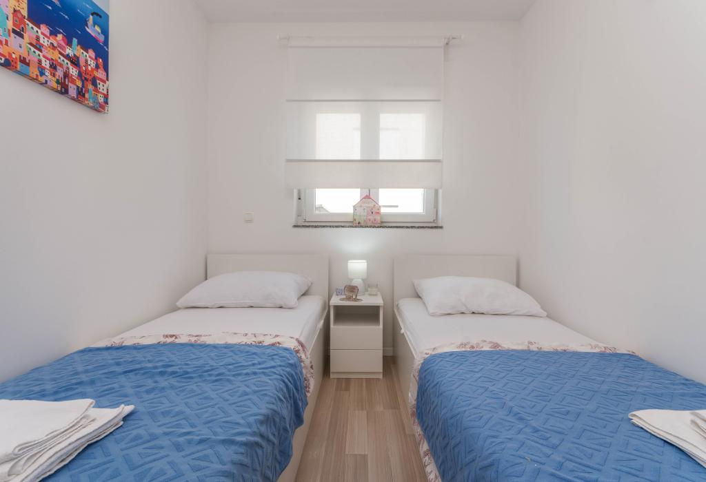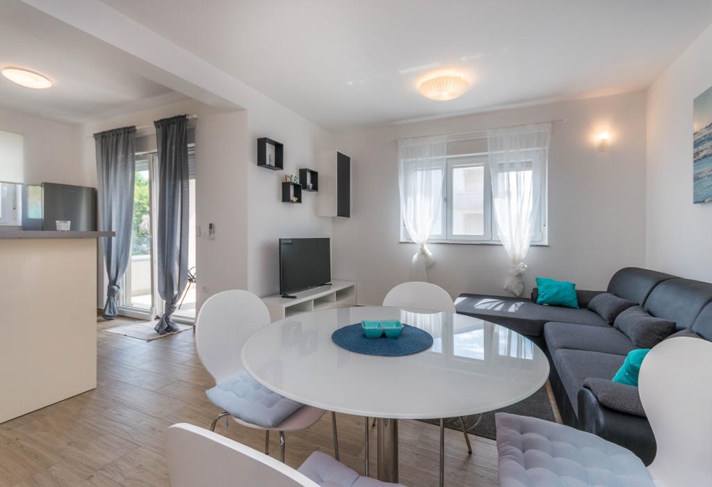 Budynek powstał jako dom składający się z 6 mieszkań, które zostały celowo wybudowane jako jednostki wolnostojące (apartamenty), z osobnym wejściem, wewnątrz wspólnej klatki schodowej. Apartament Turquoise 1 jest odpowiedni dla rodzin z dziećmi, ponieważ na 58 m2 oferuje 2 sypialnie, wygodną kuchnię z otwartym salonem. W kuchni znajduje się zmywarka, mikrofalówka, ekspres do kawy, duża lodówka z zamrażarką, kuchenka elektryczna z piekarnikiem i płyta ceramiczna. W salonie znajduje się telewizor 52”, darmowa sieć WIFI. Obok salonu znajduje się duży taras i podwórko z grillem. W łazience znajduje się pralka, suszarka do włosów, ręczniki oraz podstawowe artykuły higieniczne. plaża z drobnymi kamieniami i wybrzeżem, 100 m od centrum miasta i innych udogodnień.Apartament 2 znajduje się na 1 piętrze budynku i nie ma prawa do korzystania z podwórka.Wewnątrz łazienki nie ma pralki.