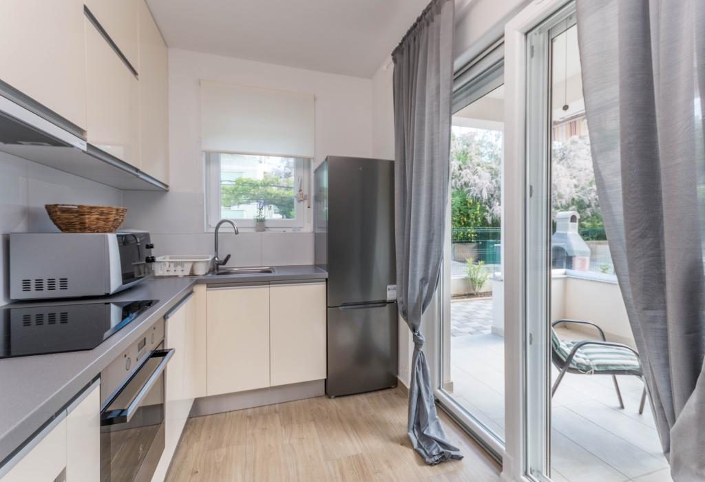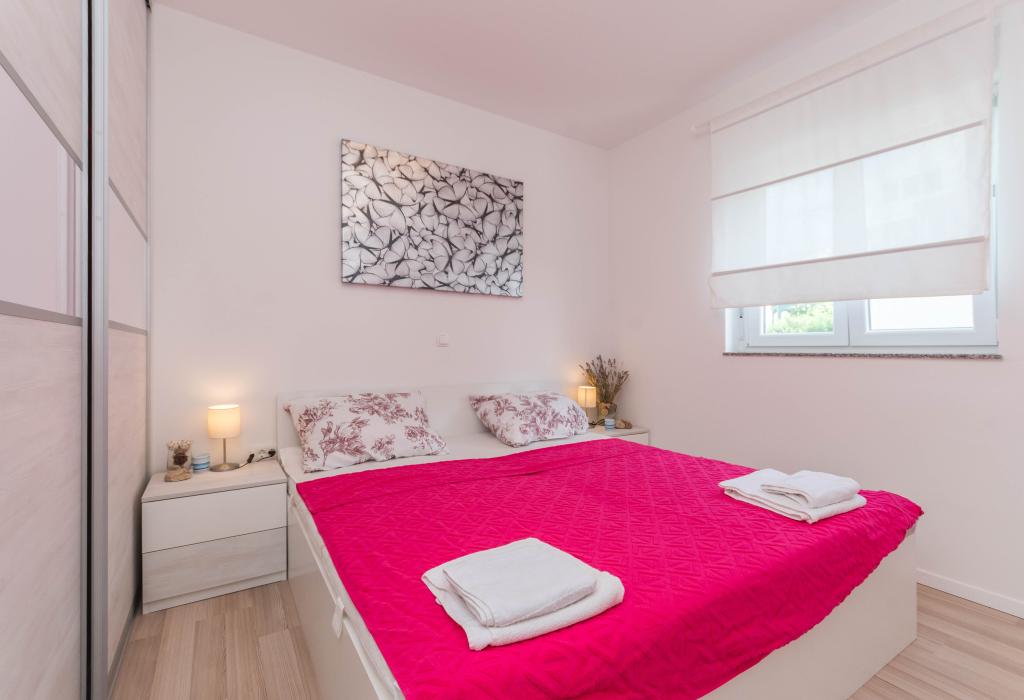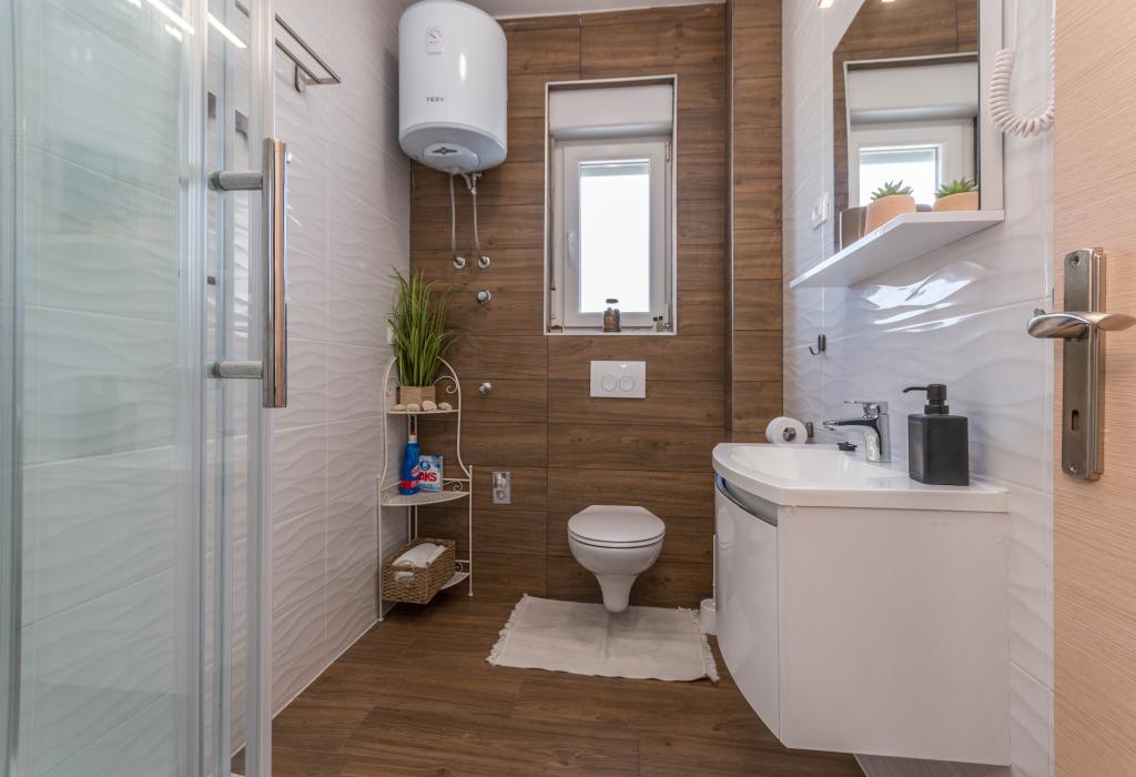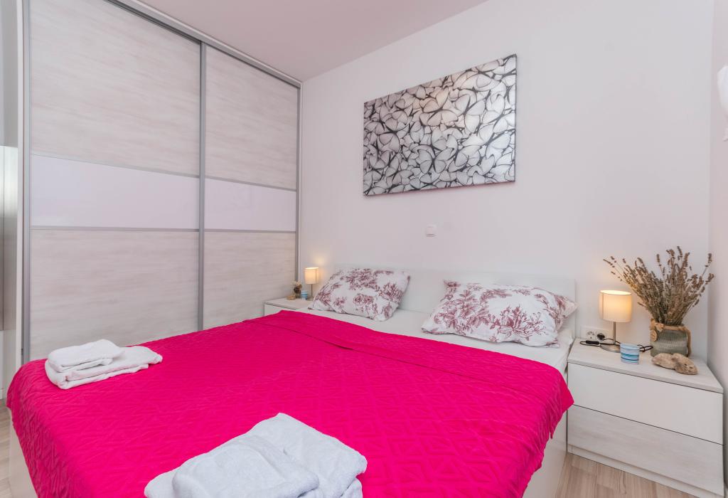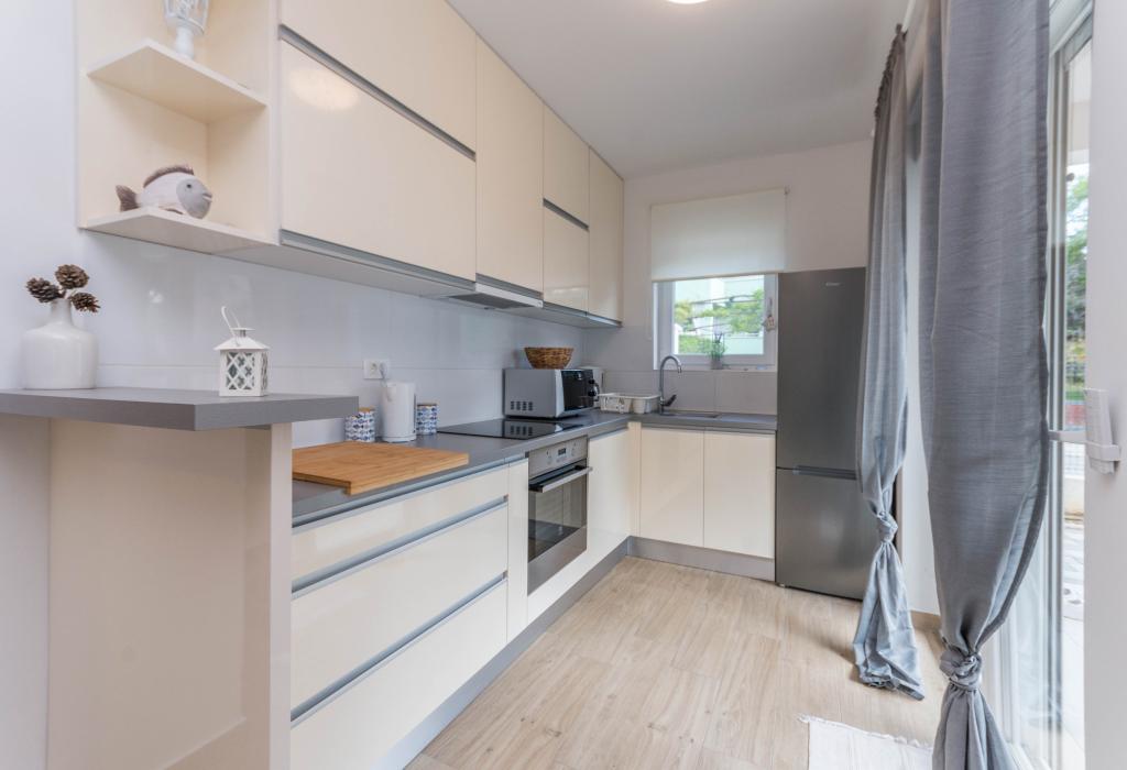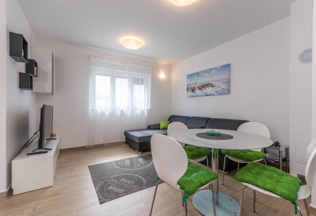 Budynek powstał jako dom składający się z 6 mieszkań, które zostały celowo wybudowane jako jednostki wolnostojące (apartamenty), z osobnym wejściem, wewnątrz wspólnej klatki schodowej. Apartament Turquoise 1 jest odpowiedni dla rodzin z dziećmi, ponieważ na 58 m2 oferuje 2 sypialnie, wygodną kuchnię z otwartym salonem. W kuchni znajduje się zmywarka, mikrofalówka, ekspres do kawy, duża lodówka z zamrażarką, kuchenka elektryczna z piekarnikiem i płyta ceramiczna. W salonie znajduje się telewizor 52”, darmowa sieć WIFI. Obok salonu znajduje się duży taras i podwórko z grillem. W łazience znajduje się pralka, suszarka do włosów, ręczniki oraz podstawowe artykuły higieniczne. plaża z drobnymi kamieniami i wybrzeżem, 100 m od centrum miasta i innych udogodnień.Apartament 2 znajduje się na 1 piętrze budynku i nie ma prawa do korzystania z podwórka.Wewnątrz łazienki nie ma pralki.