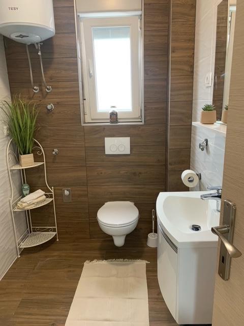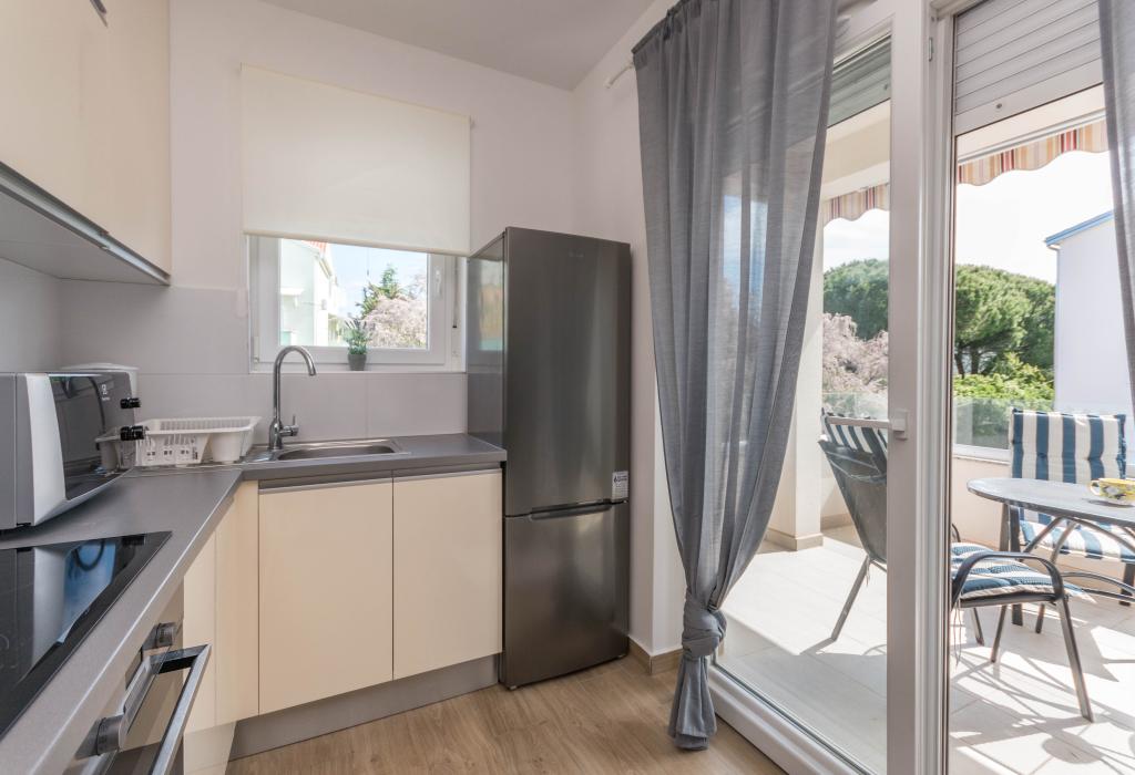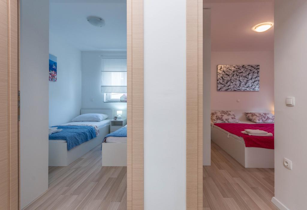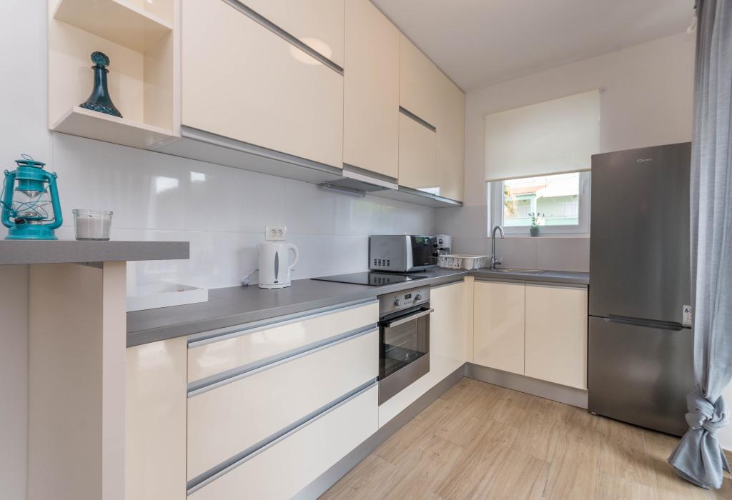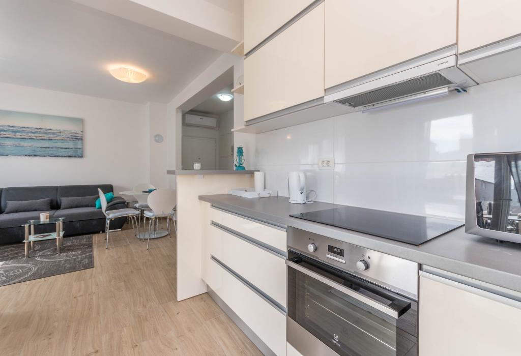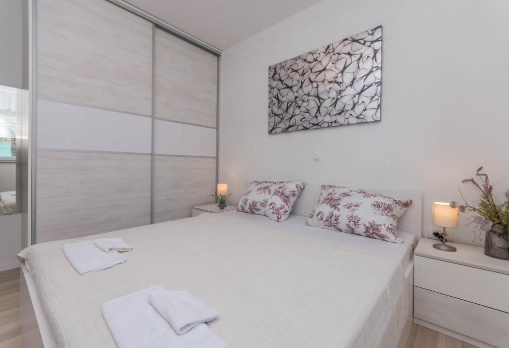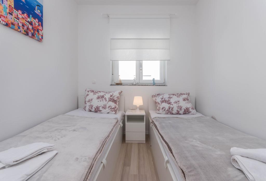 Budynek powstał jako dom składający się z 6 mieszkań, które zostały celowo wybudowane jako jednostki wolnostojące (apartamenty), z osobnym wejściem, wewnątrz wspólnej klatki schodowej. Apartament Turquoise 1 jest odpowiedni dla rodzin z dziećmi, ponieważ na 58 m2 oferuje 2 sypialnie, wygodną kuchnię z otwartym salonem. W kuchni znajduje się zmywarka, mikrofalówka, ekspres do kawy, duża lodówka z zamrażarką, kuchenka elektryczna z piekarnikiem i płyta ceramiczna. W salonie znajduje się telewizor 52”, darmowa sieć WIFI. Obok salonu znajduje się duży taras i podwórko z grillem. W łazience znajduje się pralka, suszarka do włosów, ręczniki oraz podstawowe artykuły higieniczne. plaża z drobnymi kamieniami i wybrzeżem, 100 m od centrum miasta i innych udogodnień.Apartament 2 znajduje się na 1 piętrze budynku i nie ma prawa do korzystania z podwórka.Wewnątrz łazienki nie ma pralki.