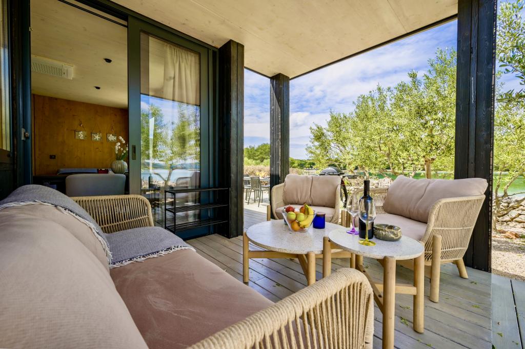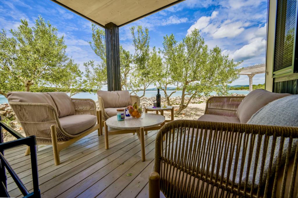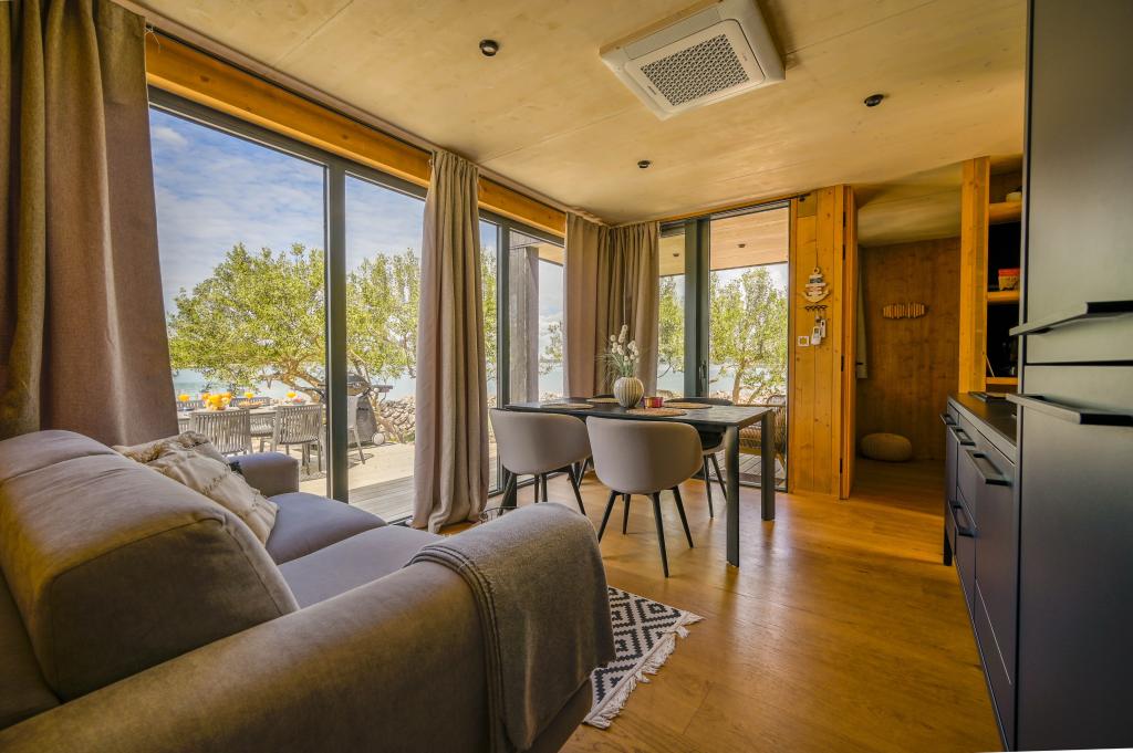 Dom mobilny znajduje się zaledwie kilka kroków od morza. Nowoczesne wnętrze apartamentu nawiązuje do typowej Dalmacji. Wokół znajdują się białe kamyki i zielone drzewa oliwne, a przed nami rozciąga się bezkresny błękit. Morze, słońce i wiatr tworzą nieopisaną grę, która zachwyca wszystkie zmysły. Niezależnie od tego, czy śpisz w jednej z dwóch sypialni, możesz cieszyć się błękitem morza i blaskiem porannego słońca. A z w pełni wyposażonej kuchni ze wszystkim, czego potrzebujesz (w tym zmywarką i zamrażarką) oraz przestronnego stołu jadalnego roztacza się niesamowity widok na taras i wszystkie uroki, jakie oferują słońce i morze. Niezależnie od tego, czy przygotowujesz posiłek w kuchni, czy grillujesz na tarasie, masz gwarancję pełnego spokoju i prywatności. Celem każdych wakacji jest pozostawienie za sobą codzienności i rutyny, a właśnie to oferuje nasz ośrodek. Mimo że wokół Ciebie znajduje się 8 podobnych budynków, możesz cieszyć się całkowitą prywatnością i spokojem, ponieważ wszyscy będą Cię wspierać. Jedynym ograniczeniem jest niebo i morze.