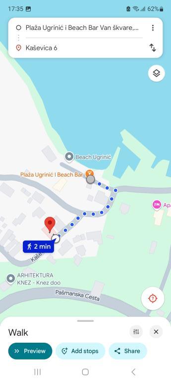 W pełni wyposażone apartamenty w spokojnej i malowniczej miejscowości Ugrinići, zaledwie 100 m od plaży. Idealne na wakacje bez tłumów i hałasu. W wiosce jest tylko kawiarnia. Pozostałe udogodnienia znajdują się około 2 km od portu promowego Tkon.