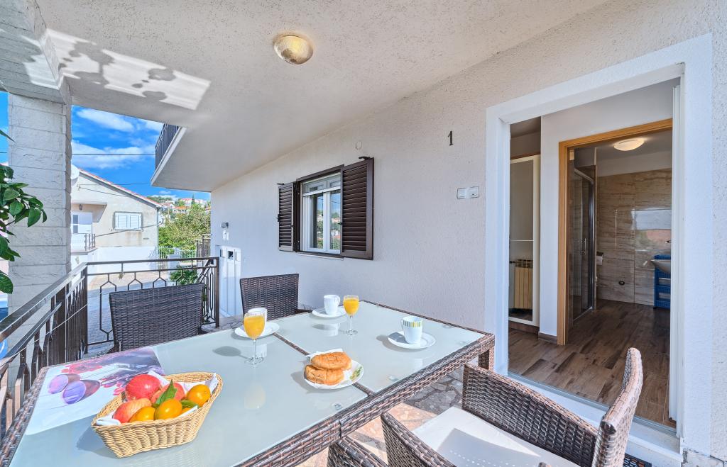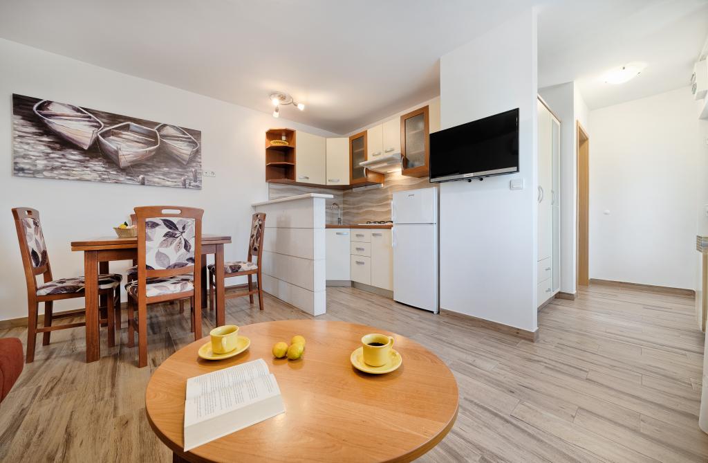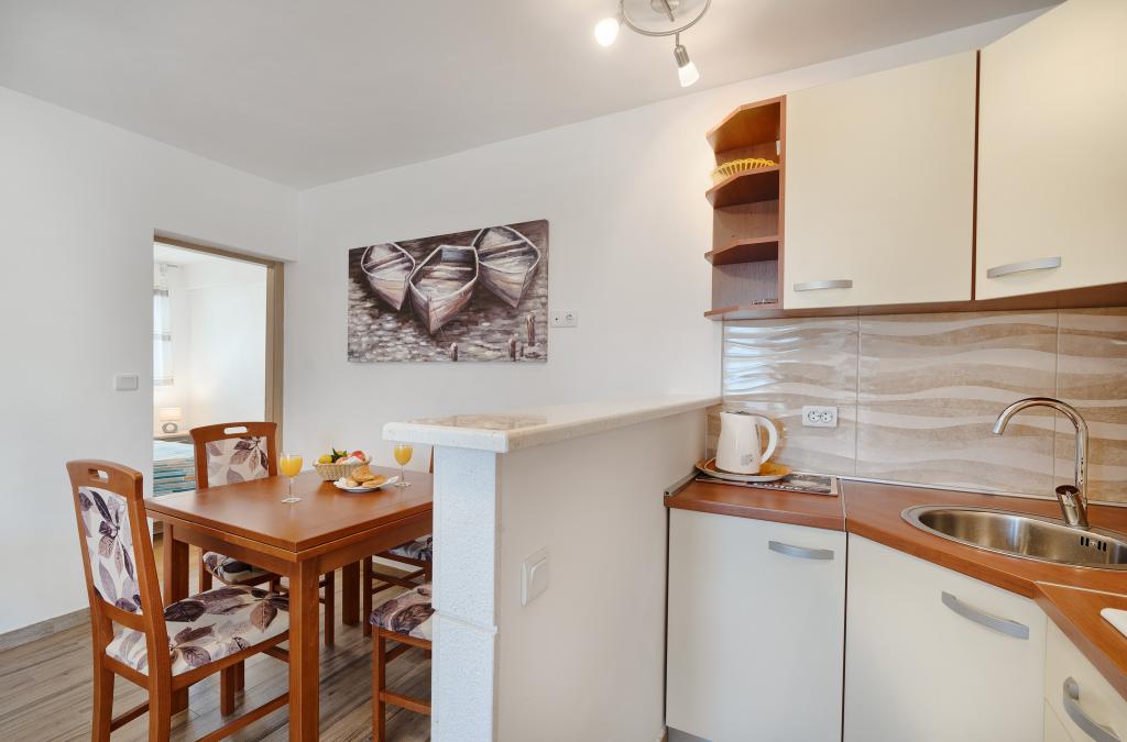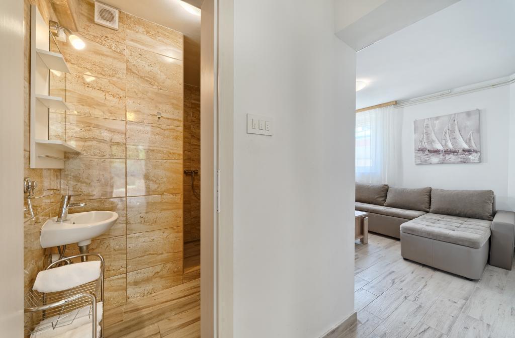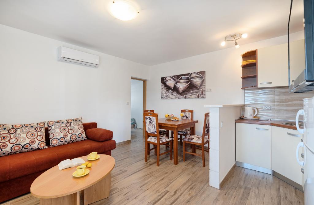 Apartamenty Bareta znajdują się na wyspie Ciovo, gmina Trogir. Znajdują się w doskonałej lokalizacji dla tych, którzy chcą cieszyć się słońcem i morzem, a także dla tych, którzy chcą poznać historyczne i naturalne piękno Środkowej Dalmacji. Stare Miasto UNESCO w Trogirze znajduje się zaledwie 1000 metrów od hotelu, a Split (Pałac Dioklecjana, promy na wyspy), Omiš, Cetina (rafting, kanioning, wspinaczka), wodospady Krka i Szybenik znajdują się w odległości 50 km. Lotnisko w Splicie znajduje się zaledwie 5 km od hotelu. Apartamenty znajdują się na parterze rodzinnego domu otoczonego ogrodem i zielenią. Każdy apartament ma własne wejście i możliwy jest duży taras ze stołem, parking, grill i prysznic na świeżym powietrzu. Apartamenty składają się z salonu połączonego z kuchnią, sypialni (łóżko 2 1, 2 2), ewentualnie dwóch dorosłych z dwójką dzieci, łazienki z toaletą. Apartamenty są w pełni wyposażone we wszystko, czego potrzeba do komfortowego pobytu / naczynia, pościel itp.) Tr