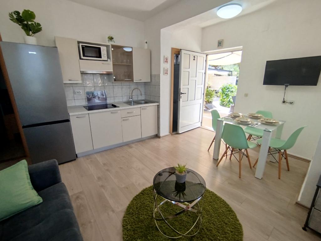 Apartament 2+1 duży - świetny, bardzo blisko plaży. Minusem jest brak prysznicy na plaży oraz bardzo mało lokali gdzie można zjeść. W restauracjach płatność tylko gotówką. 2 km od Trogiru gdzie jest wszystko co potrzeba. Polecam jeśli szukacie ciszy, spokoju i sami będziecie gotować.