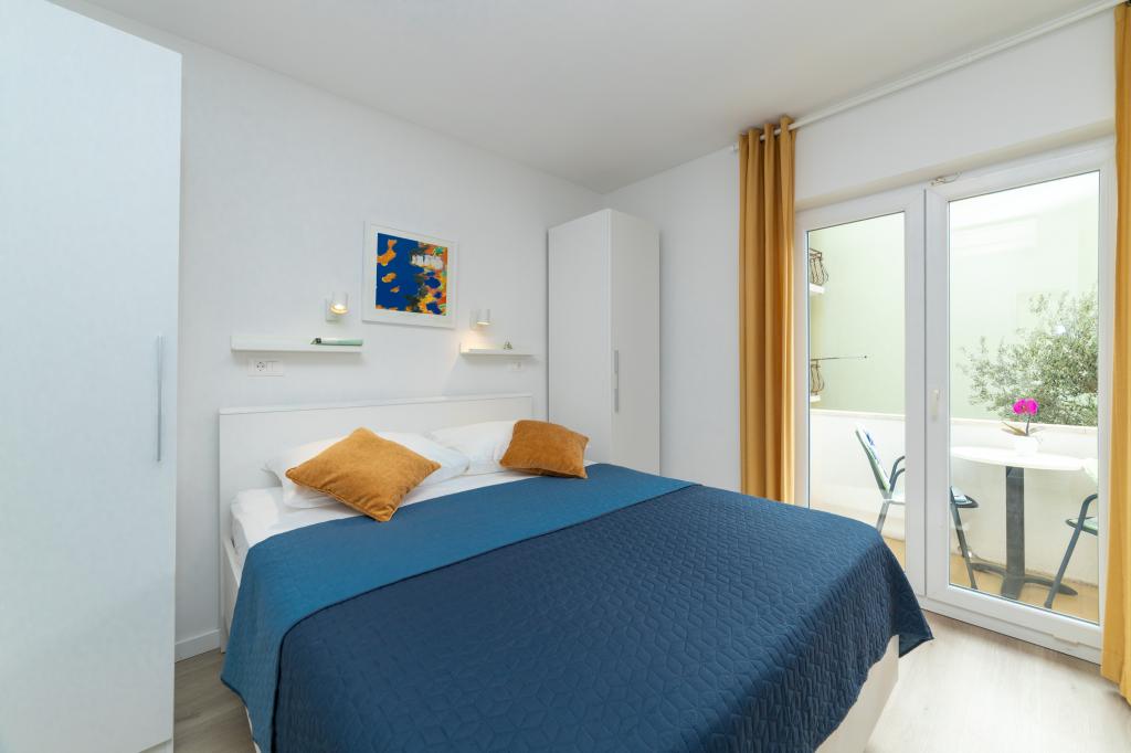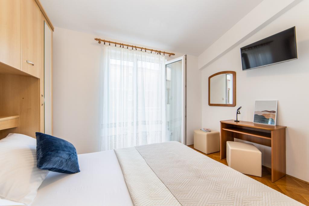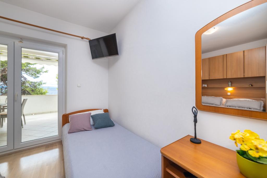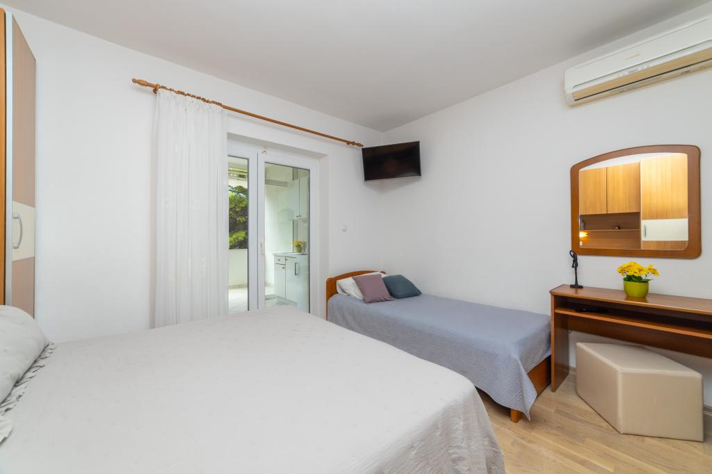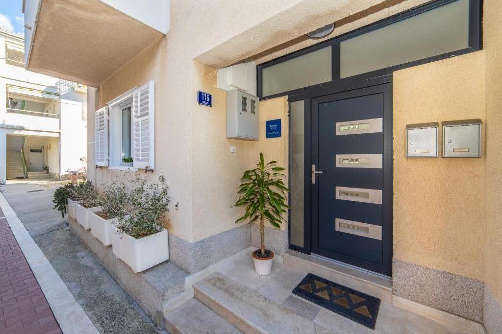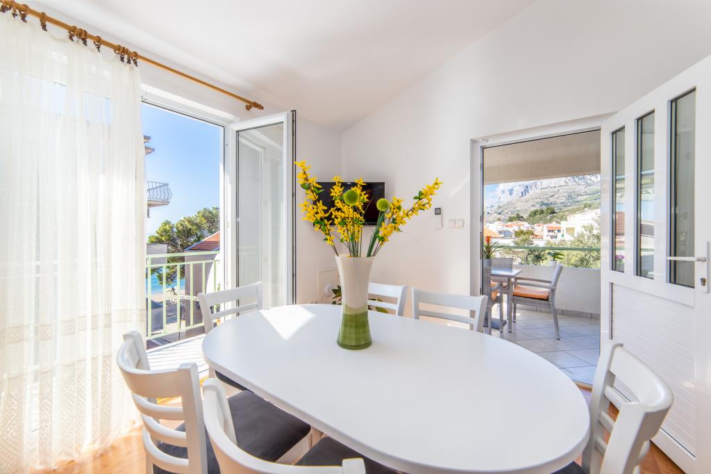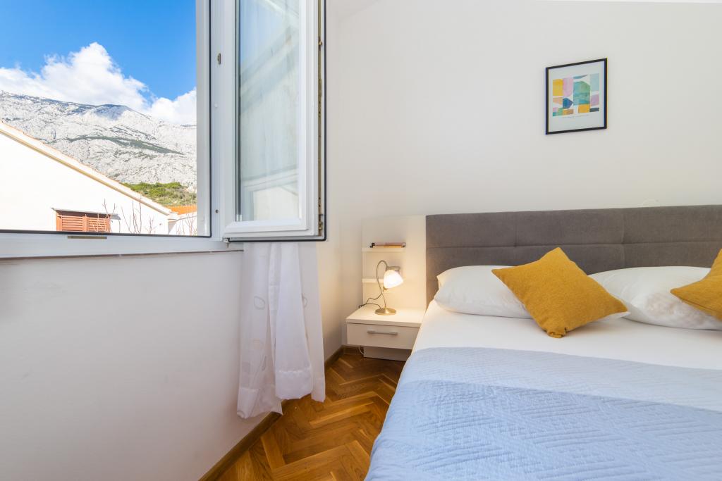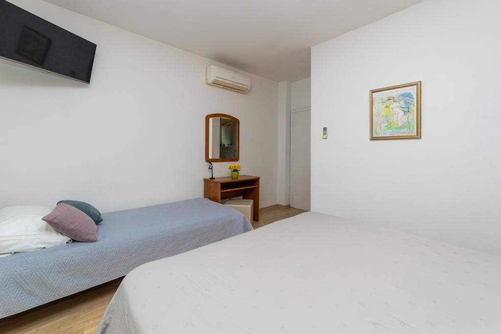 Posiadamy apartamenty w dwóch budynkach. Znajdujemy się 100 m od centrum Tučepi, przystani, apteki i lekarza. W promieniu 20-50 m znajdują się liczne restauracje, piekarnie, cukiernie, kawiarnie oraz supermarket. Parking znajduje się na podwórku między dwoma budynkami. Dom 1 znajduje się w pierwszym rzędzie nad morzem i posiada dwa apartamenty 2+1 z widokiem na morze i dużymi tarasami oraz dwa pokoje z łazienkami, lodówkami i balkonami dla dwóch osób plus dodatkowe łóżko. Znajdują się one na pierwszym piętrze budynku. Wszystkie pokoje i apartamenty są klimatyzowane. Dom 2 znajduje się za domem 1 i znajduje się 20 m od morza. Oferujemy duże apartamenty dla 4-5 osób z osobnymi wejściami, dwiema oddzielnymi sypialniami, świeżo wyremontowaną łazienką i pokojem dziennym. Wszystkie pokoje w apartamentach są klimatyzowane i wyposażone w telewizję satelitarną i internet. Przed nimi duży taras z widokiem na morze. Apartamenty są przestronne i mają powierzchnię 50-60 m2.