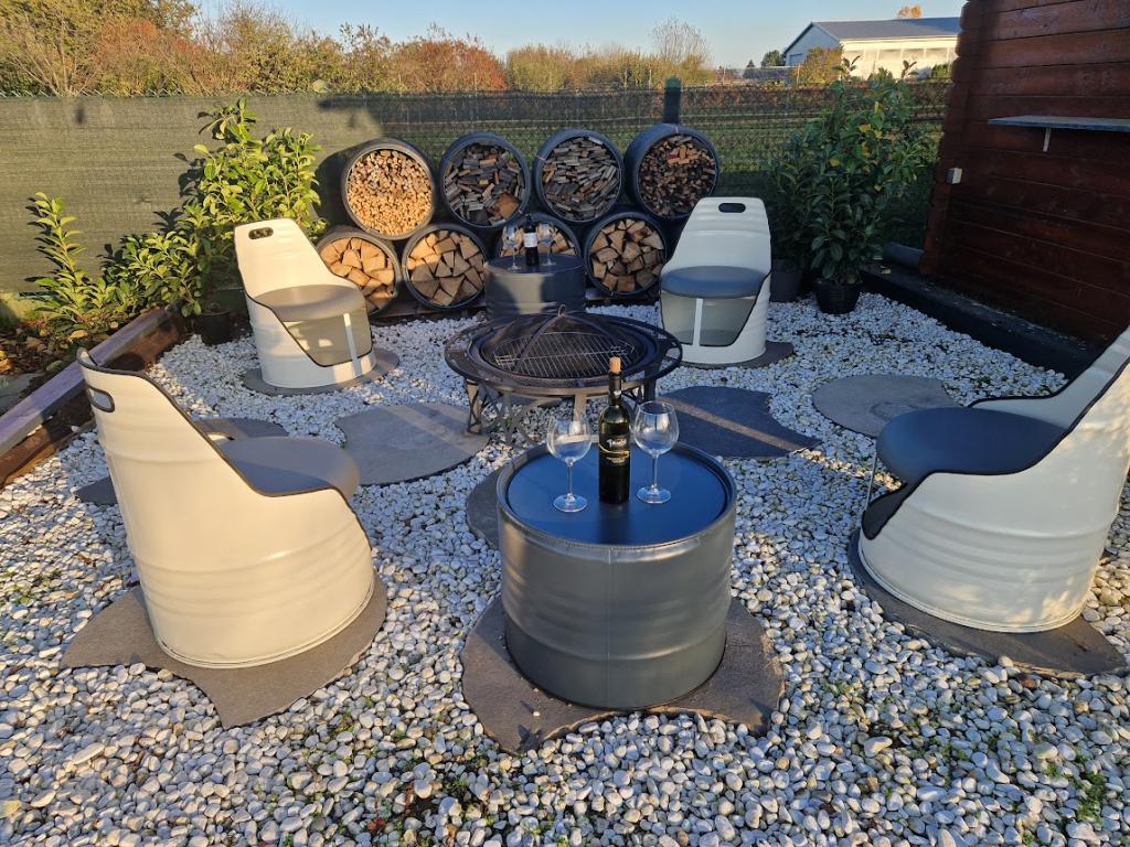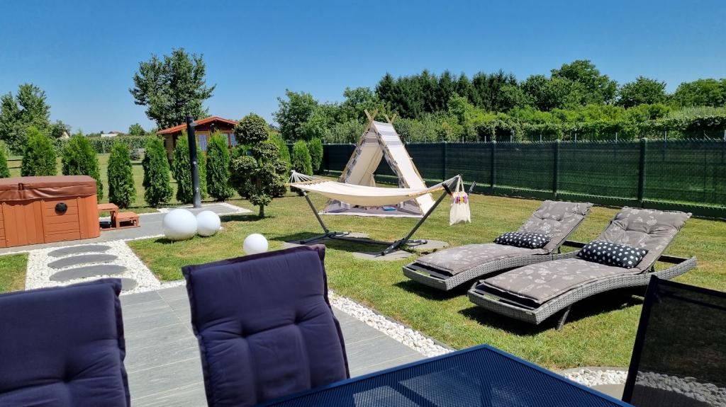 Korzystanie z jacuzzi jest wliczone w cenę pobytu i nie podlega dodatkowym opłatom. Obok domu znajduje się duży taras z grillem, leżakami, hamakiem, prysznicem solarnym i dużym, zadbanym trawnikiem. Ponadto istnieje możliwość wypożyczenia rowerów (za dodatkową opłatą), skorzystania z elektrycznych rzutek, paleniska na podwórku i innego sprzętu sportowego, piaskownicy dla małych dzieci, namiotu do zabawy... Dozwolone są małe, grzeczne zwierzęta domowe, możliwa jest dodatkowa opłata za sprzątanie. Podwórko jest całkowicie ogrodzone.
