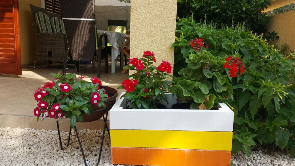 Drodzy Goście, czekają na Państwa dwa pięknie urządzone apartamenty położone w spokojnej części miejscowości Vir, wśród zieleni, niedaleko centrum miasta. Apartamenty znajdują się na pierwszym piętrze domu rodzinnego i posiadają osobne wejścia. Każdy apartament ma duży taras wyposażony w stół, krzesła i parasol, na którym można napić się porannej kawy, ciesząc się zapachem śródziemnomorskich ziół i śpiewem świerszczy. Na podwórku znajduje się parking, a także możliwość korzystania z grilla. Apartamenty znajdują się 5 minut spacerem od pierwszej plaży, Lučica, i dziesięć minut od centrum miasta, gdzie odbywają się bezpłatne koncerty, oraz od plaży Jadro. W pobliżu znajdują się dobrze zaopatrzone sklepy, kawiarnie, restauracje, kluby i tawerny, plac zabaw dla dzieci, aquapark oraz liczne plaże, od piaszczystych po żwirowe i betonowe, z towarzyszącą infrastrukturą. Zaletą naszej lokalizacji jest to, że można dotrzeć na plażę od strony północnej i południowej oraz do wszystkich niezbędnych udogodnień pieszo. Dom znajduje się na końcu ślepej uliczki bez dużego ruchu. Z dużą ilością słońca i krystalicznie czystym morzem, będziesz mieć niezapomniane wakacje.