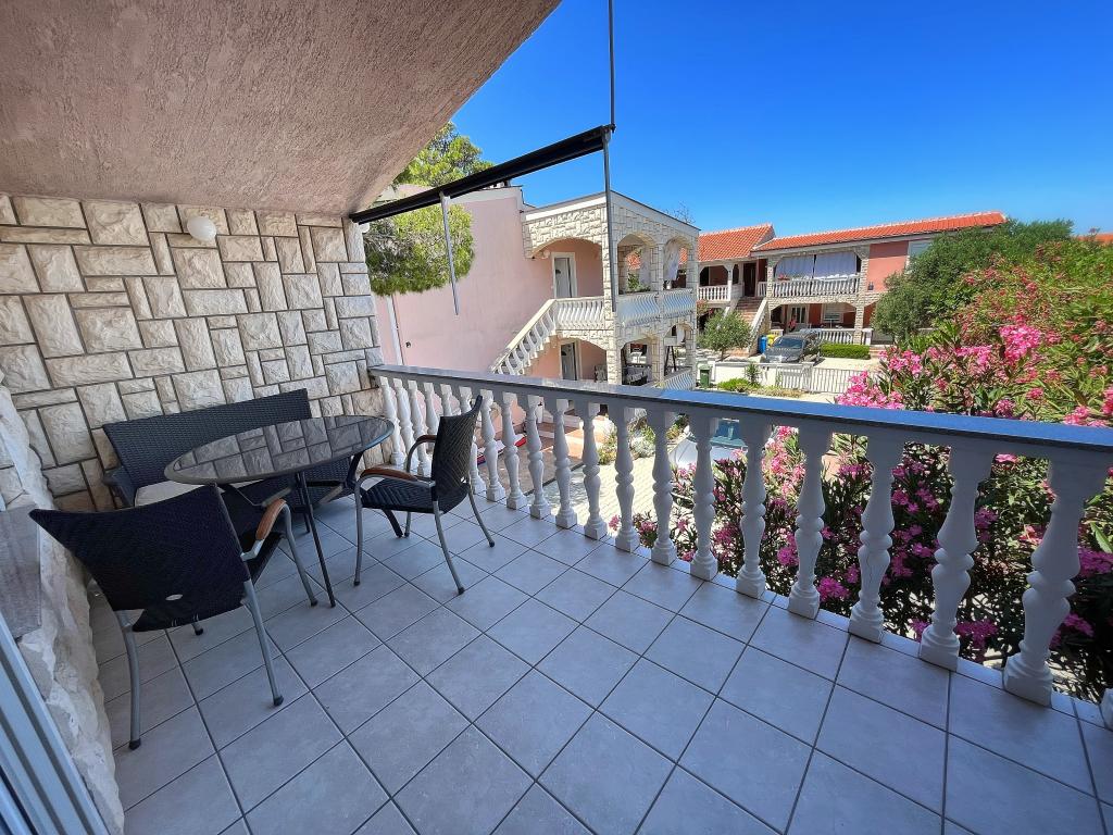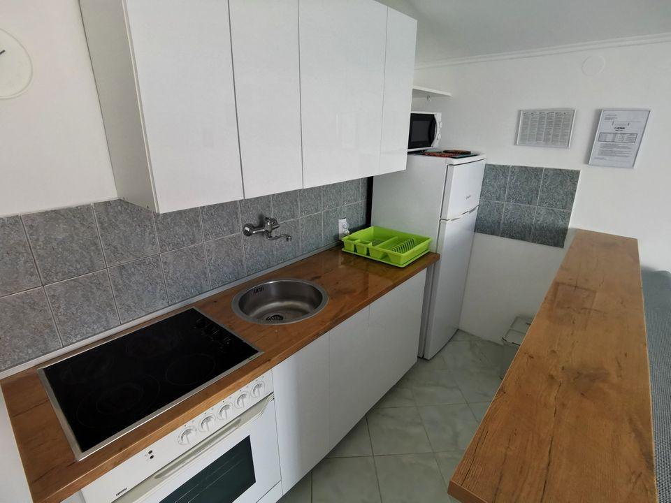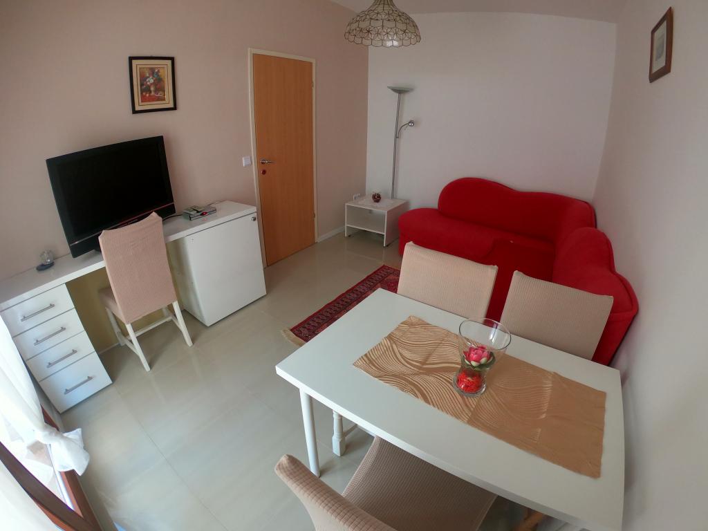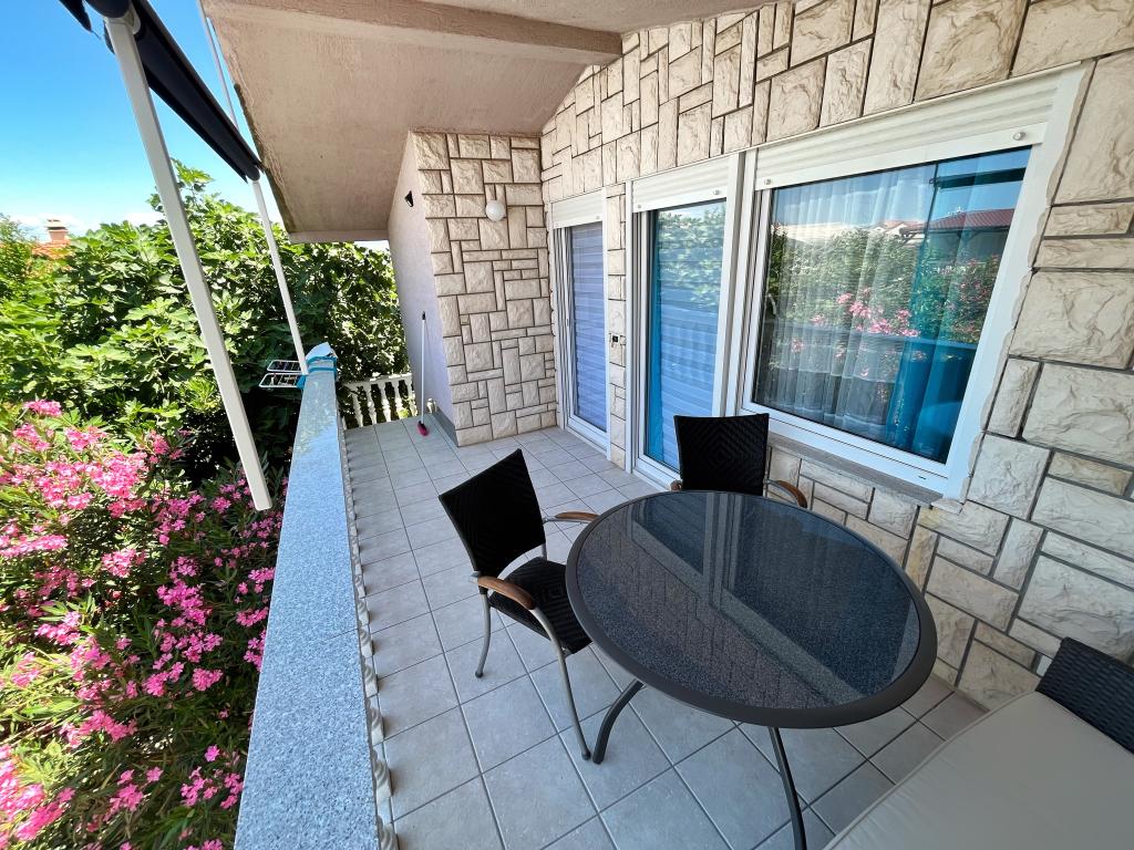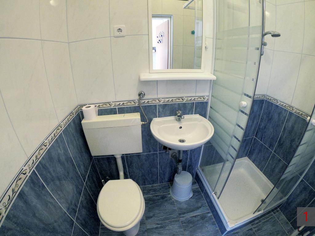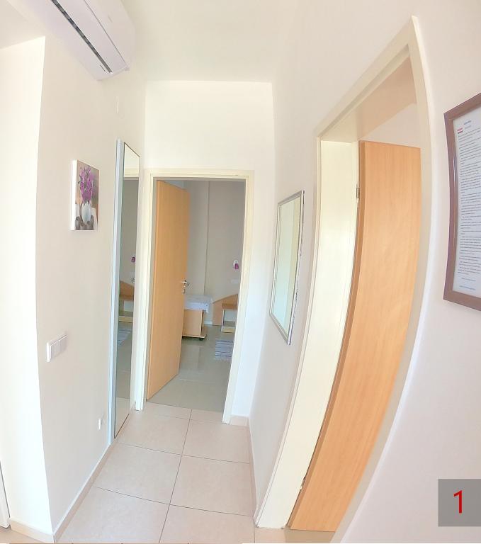 Apartament - 1 - składa się z dwóch osobnych pokoi, osobnej kuchni i łazienki. W jednym pokoju znajduje się podwójne łóżko, w drugim narożnik. Do mieszkania przynależy zadaszony taras o powierzchni 50 m2 otoczony lasem sosnowym. Ogromnym atutem apartamentu jest położenie na końcu ślepej, cichej i wyłączonej z ruchu ulicznego, co daje gwarancję spokoju i prywatności. Na terenie budynku znajduje się miejsce parkingowe oraz grill do grillowania.