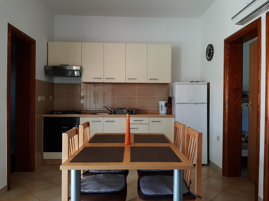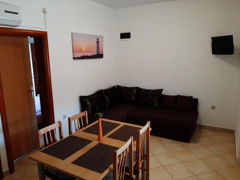 Do wynajęcia pięknie urządzone i zadbane apartamenty, składające się z sypialni z łóżkiem małżeńskim, pokoju dziecięcego z łóżkiem piętrowym, salonu z narożnikiem z telewizorem LCD, bezpłatne WI FI 4G. Kuchnia znajduje się w salonie i składa się z górnego i dolnego elementu z zabudowaną płytą grzewczą i piekarnikiem, okapem, zlewozmywakiem z ciepłą i zimną wodą. Łazienka składa się z kabiny prysznicowej, umywalki, szafki z lustrem oraz toalety. Goście przynoszą ze sobą ręczniki łazienkowe oraz wszelkie środki higieny osobistej. Apartamenty posiadają taras z okrągłym stołem i 4 krzesłami, miejsce parkingowe na 1 samochód na aplikację znajduje się na podwórku, gdzie znajduje się również grill i prysznic na zewnątrz do dyspozycji gości. Apartamenty znajdują się w bezpośrednim sąsiedztwie głównej plaży w Žitna uvala, posiadają certyfikat energetyczny i są zarejestrowane do wynajęcia. Na plaży są 3 kawiarnie, fast food, piekarnia, które działają cały dzień. W promieniu 300 m znajdują się 3 sklepy.