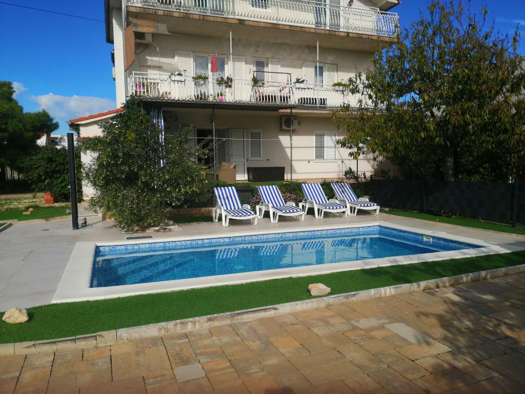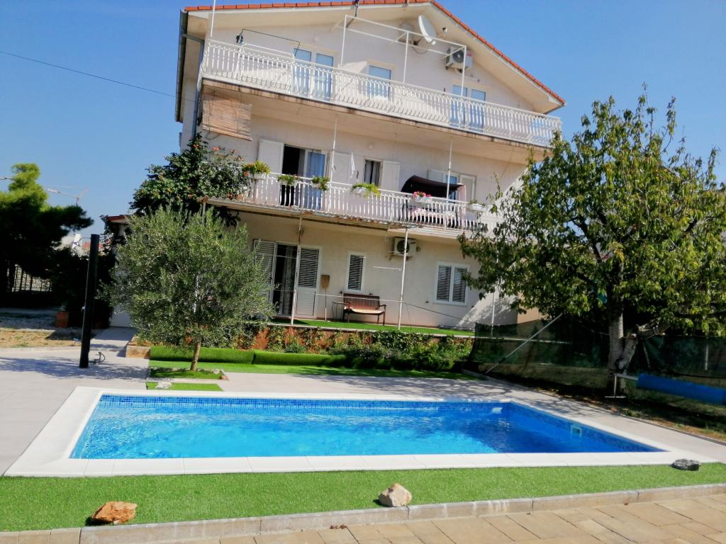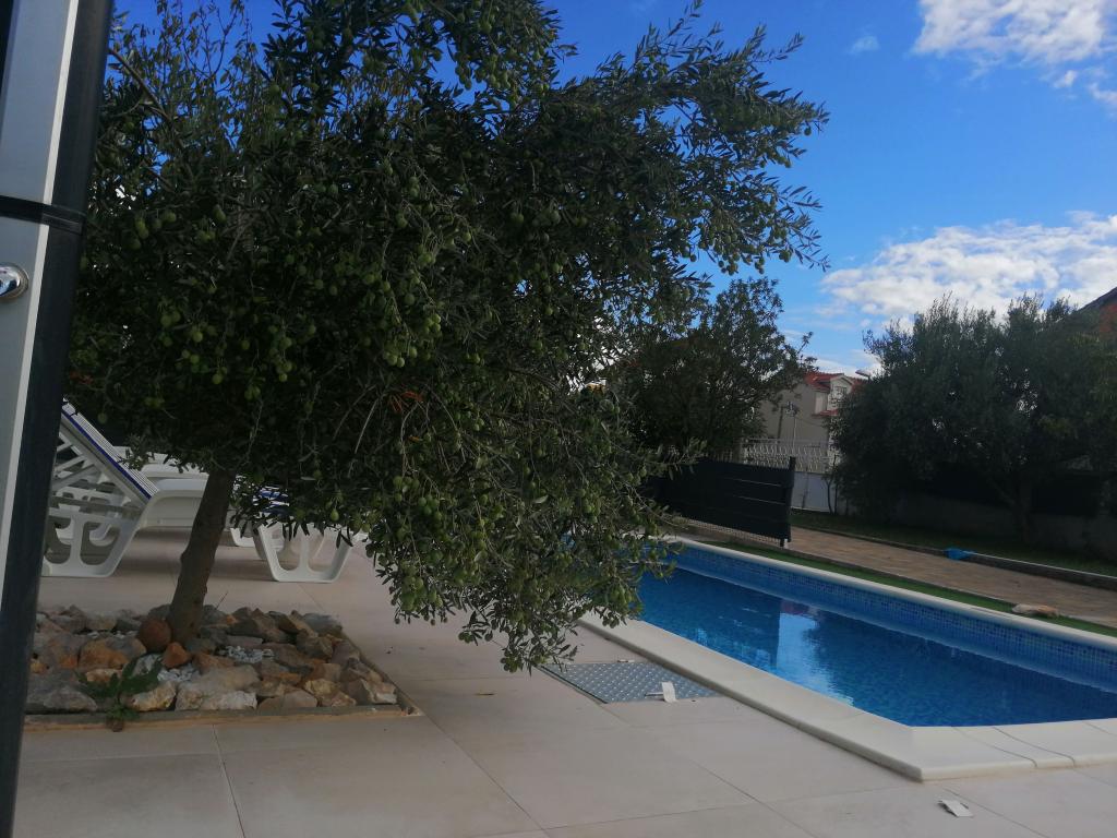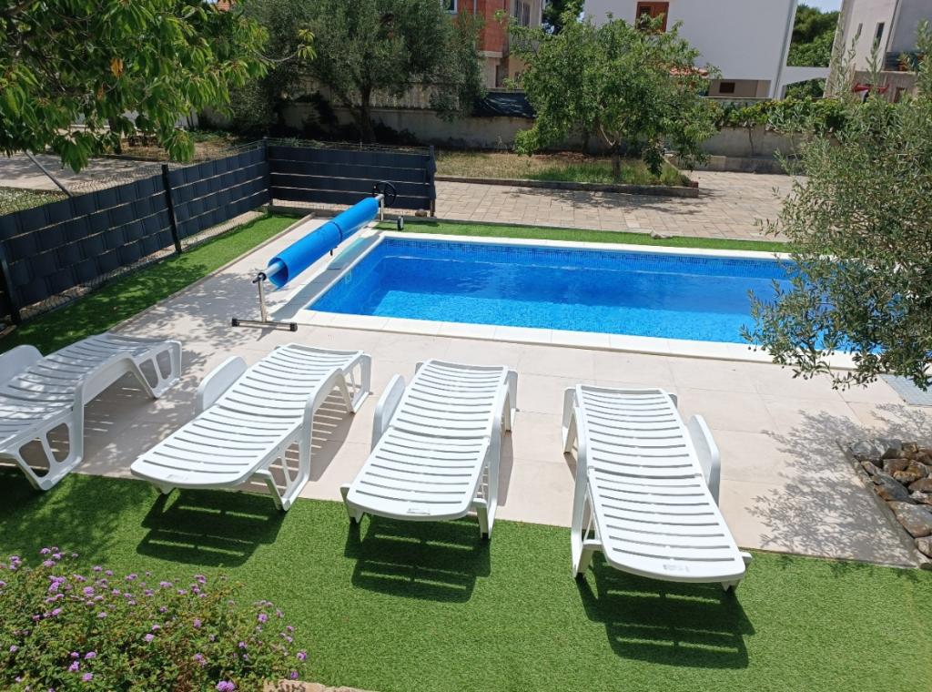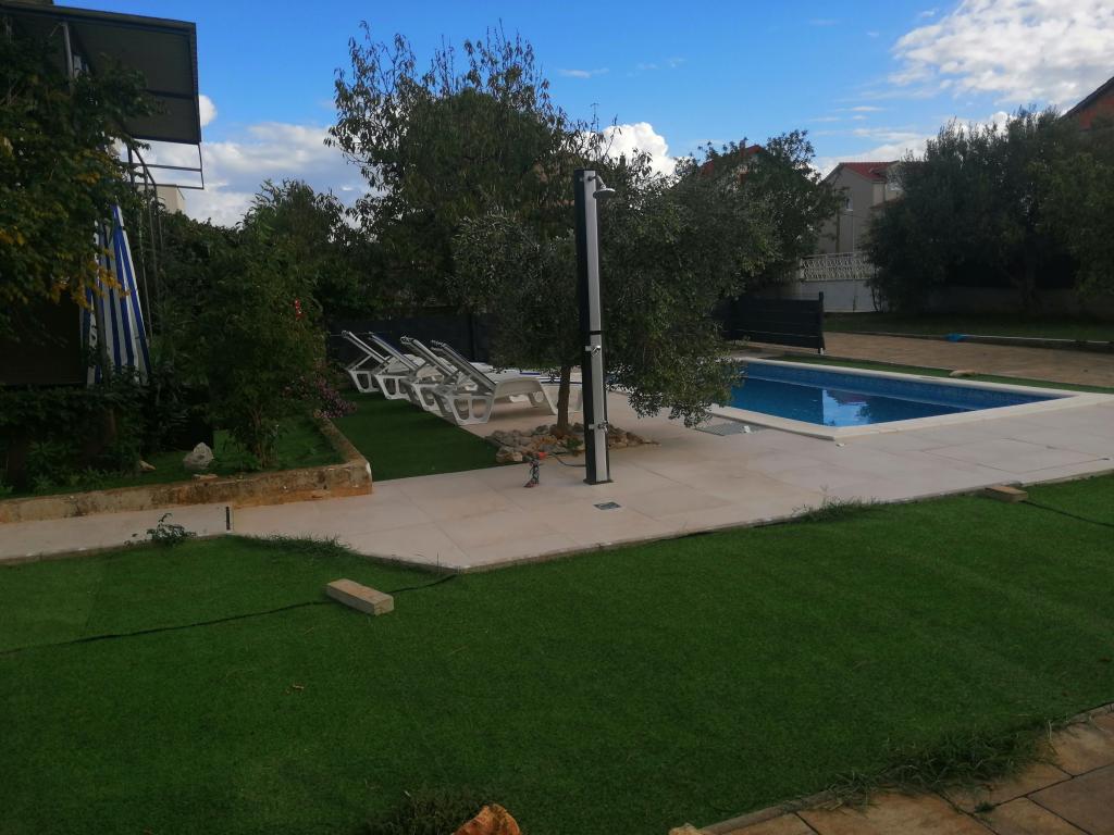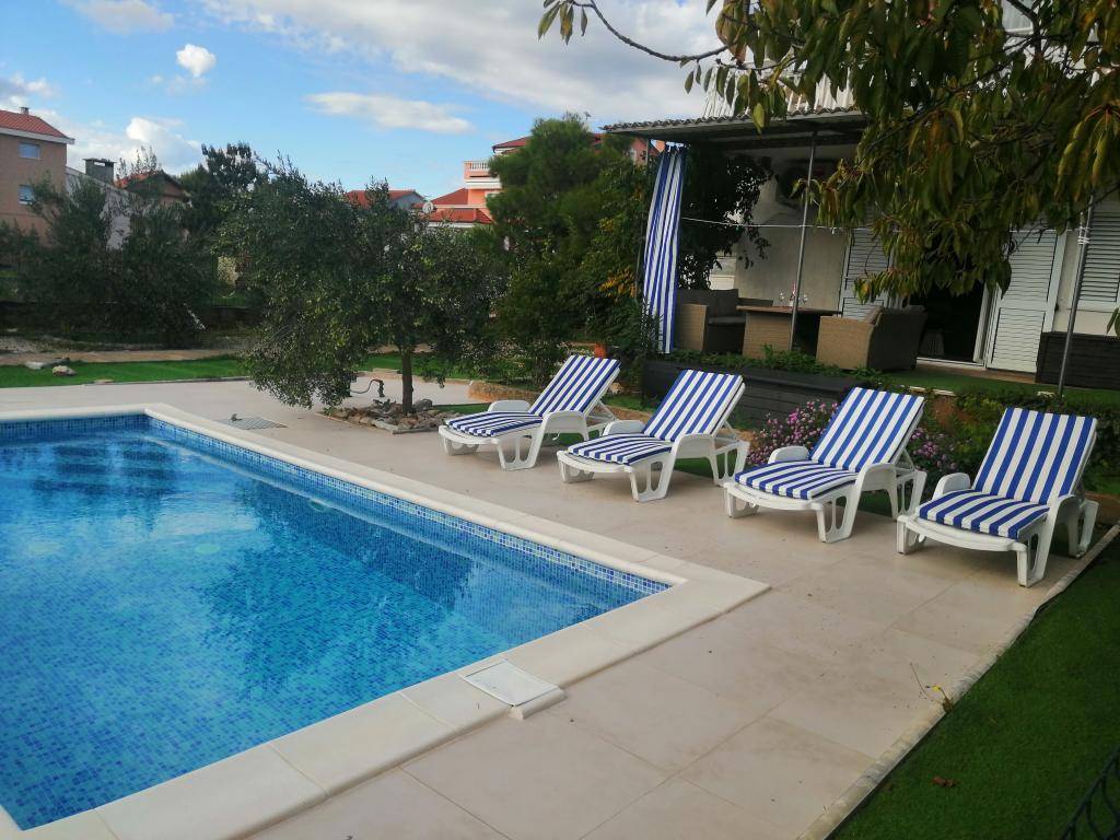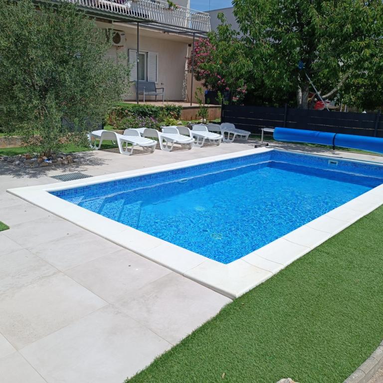 Nowo wyremontowane duże apartamenty z zewnętrznym BASENEM TYLKO DLA CIEBIE!! JAK DOM WAKACYJNY!! Całkowicie NOWO WYREMONTOWANA kuchnia z nowymi urządzeniami (lodówka, zamrażarka, piekarnik, płyta grzewcza, kuchenka mikrofalowa, czajnik, zmywarka, pralka, okap). Naczynia i przybory kuchenne. Salon z narożną sofą, którą w razie potrzeby można rozłożyć na przestronne łóżko. Nowy telewizor z kanałami satelitarnymi. Sypialnie z przestronnymi łóżkami podwójnymi. Pościel. Wszystkie pokoje są klimatyzowane. Dwie łazienki z toaletą i kabinami prysznicowymi, nowo wyremontowane. Pralka, sprzęt do prasowania, suszarka do włosów. Odkurzacz i środki czyszczące, papier toaletowy, mydło, ręczniki. Do dyspozycji Gości jest również taras o powierzchni 30 m2 z meblami ogrodowymi, a także grill, leżaki przy basenie. Ogromny ogród o powierzchni 1300 m2 z mnóstwem śródziemnomorskich drzew. Parking na podwórku BEZPŁATNY!!. Lotniska w Zadarze i Splicie oddalone są o około 60 km. Blisko parków narodowych Krka i Kornati