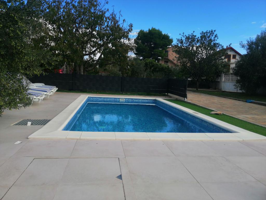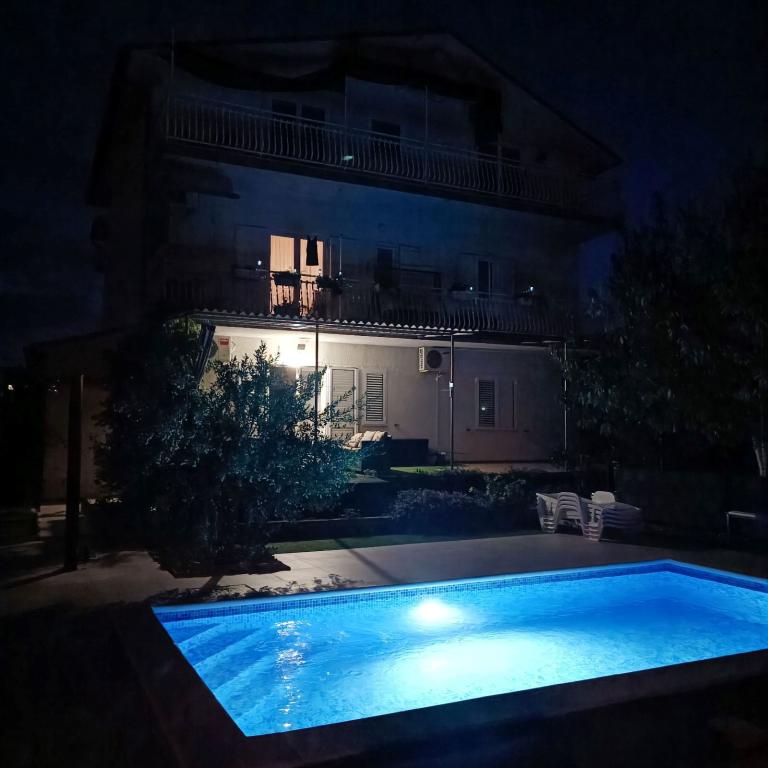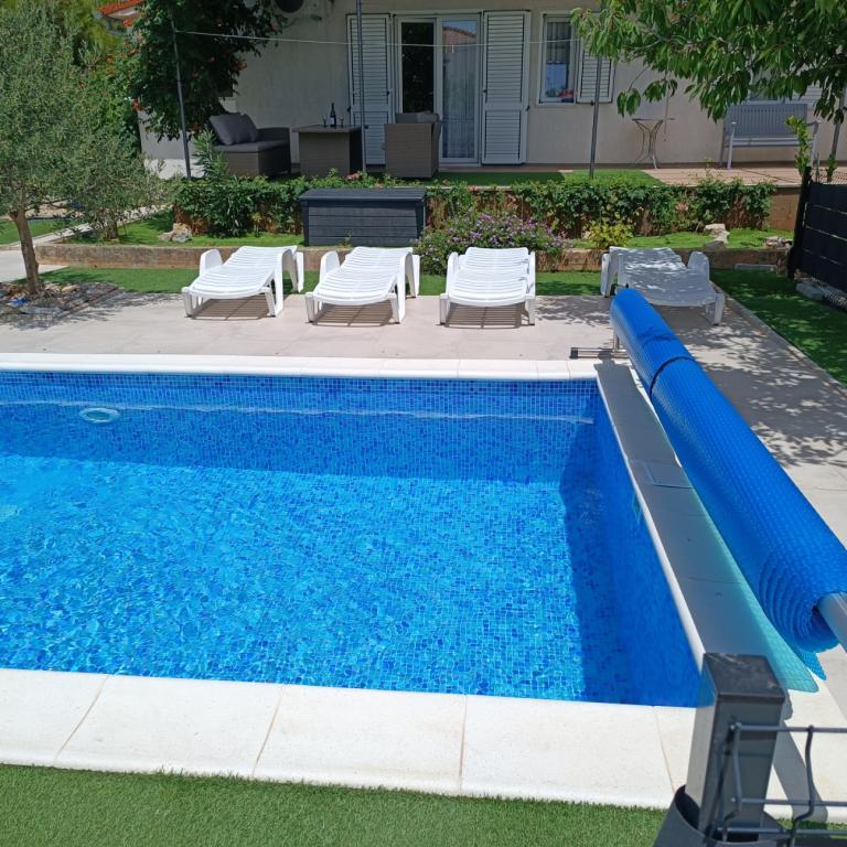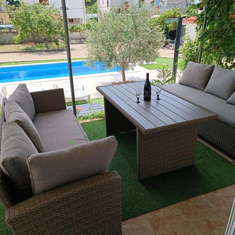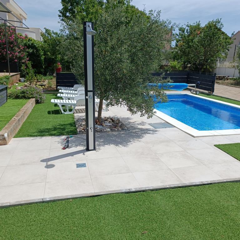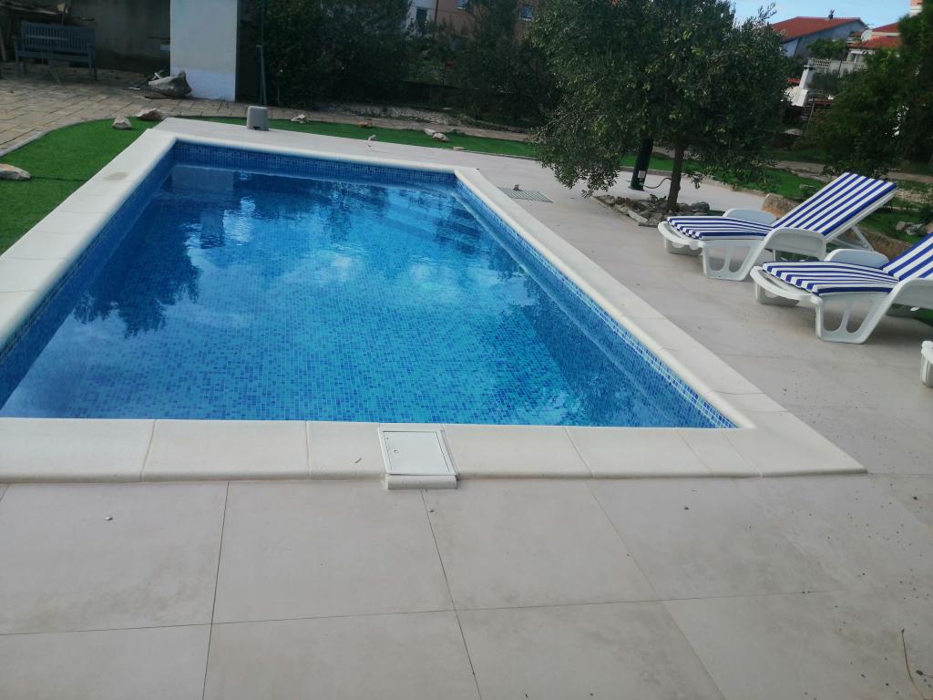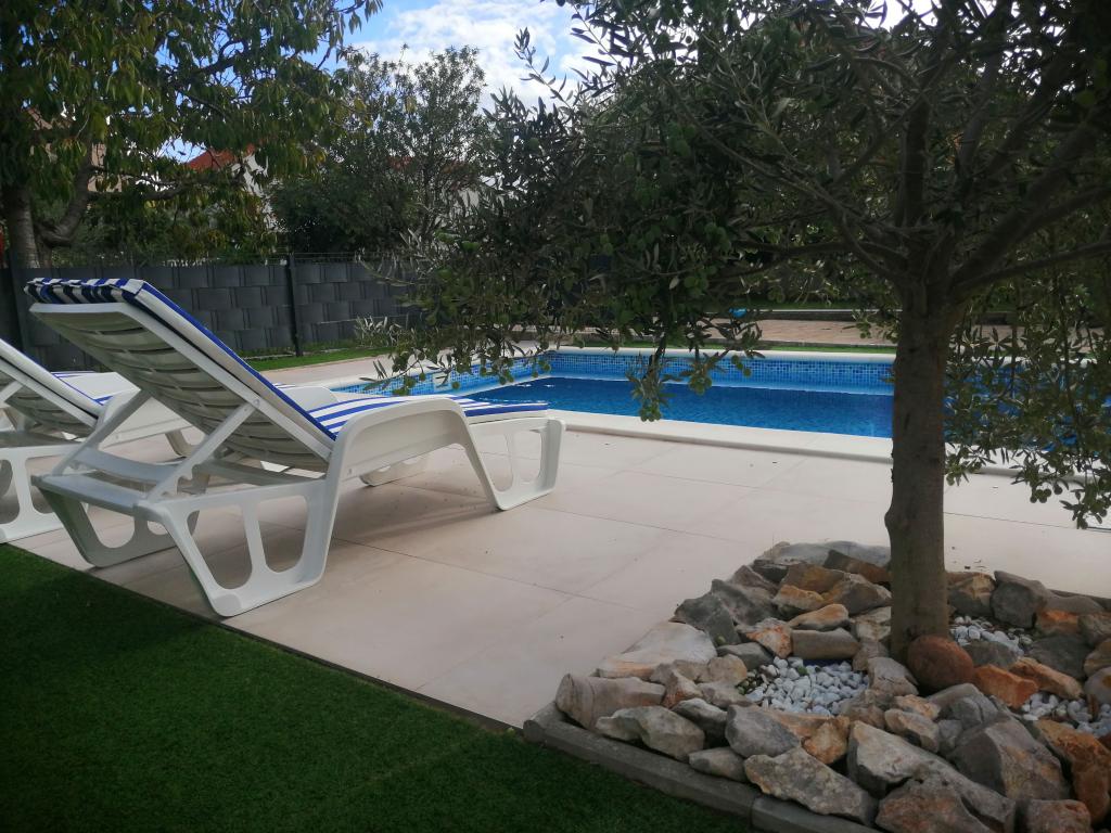 Nowo wyremontowane duże apartamenty z zewnętrznym BASENEM TYLKO DLA CIEBIE!! JAK DOM WAKACYJNY!! Całkowicie NOWO WYREMONTOWANA kuchnia z nowymi urządzeniami (lodówka, zamrażarka, piekarnik, płyta grzewcza, kuchenka mikrofalowa, czajnik, zmywarka, pralka, okap). Naczynia i przybory kuchenne. Salon z narożną sofą, którą w razie potrzeby można rozłożyć na przestronne łóżko. Nowy telewizor z kanałami satelitarnymi. Sypialnie z przestronnymi łóżkami podwójnymi. Pościel. Wszystkie pokoje są klimatyzowane. Dwie łazienki z toaletą i kabinami prysznicowymi, nowo wyremontowane. Pralka, sprzęt do prasowania, suszarka do włosów. Odkurzacz i środki czyszczące, papier toaletowy, mydło, ręczniki. Do dyspozycji Gości jest również taras o powierzchni 30 m2 z meblami ogrodowymi, a także grill, leżaki przy basenie. Ogromny ogród o powierzchni 1300 m2 z mnóstwem śródziemnomorskich drzew. Parking na podwórku BEZPŁATNY!!. Lotniska w Zadarze i Splicie oddalone są o około 60 km. Blisko parków narodowych Krka i Kornati