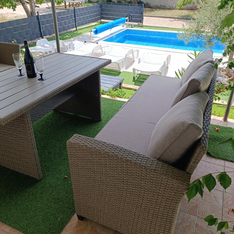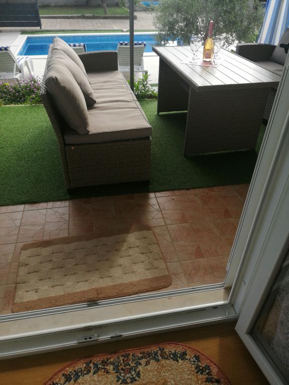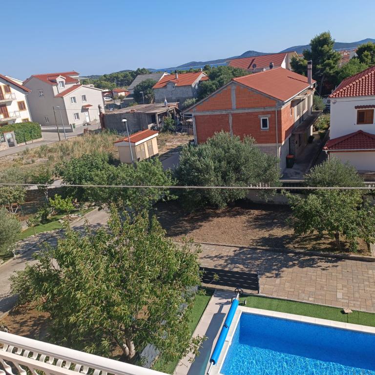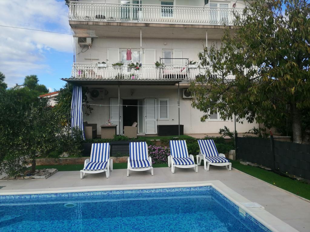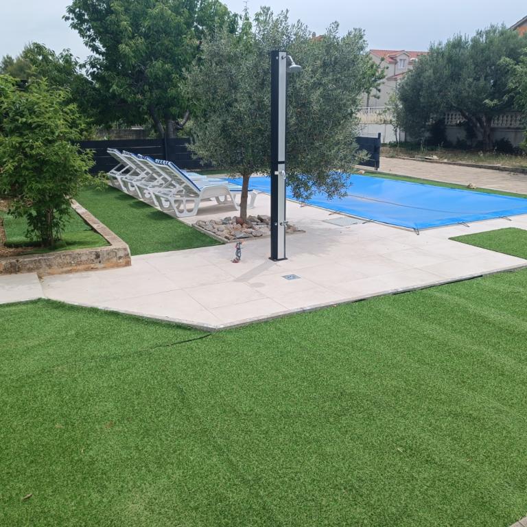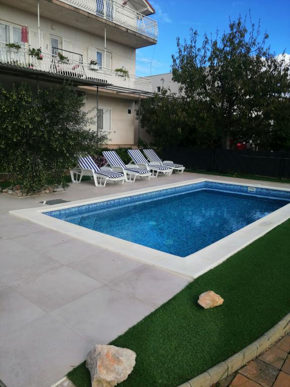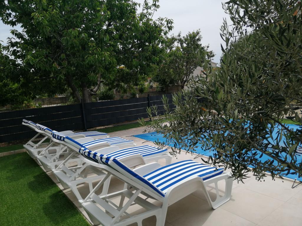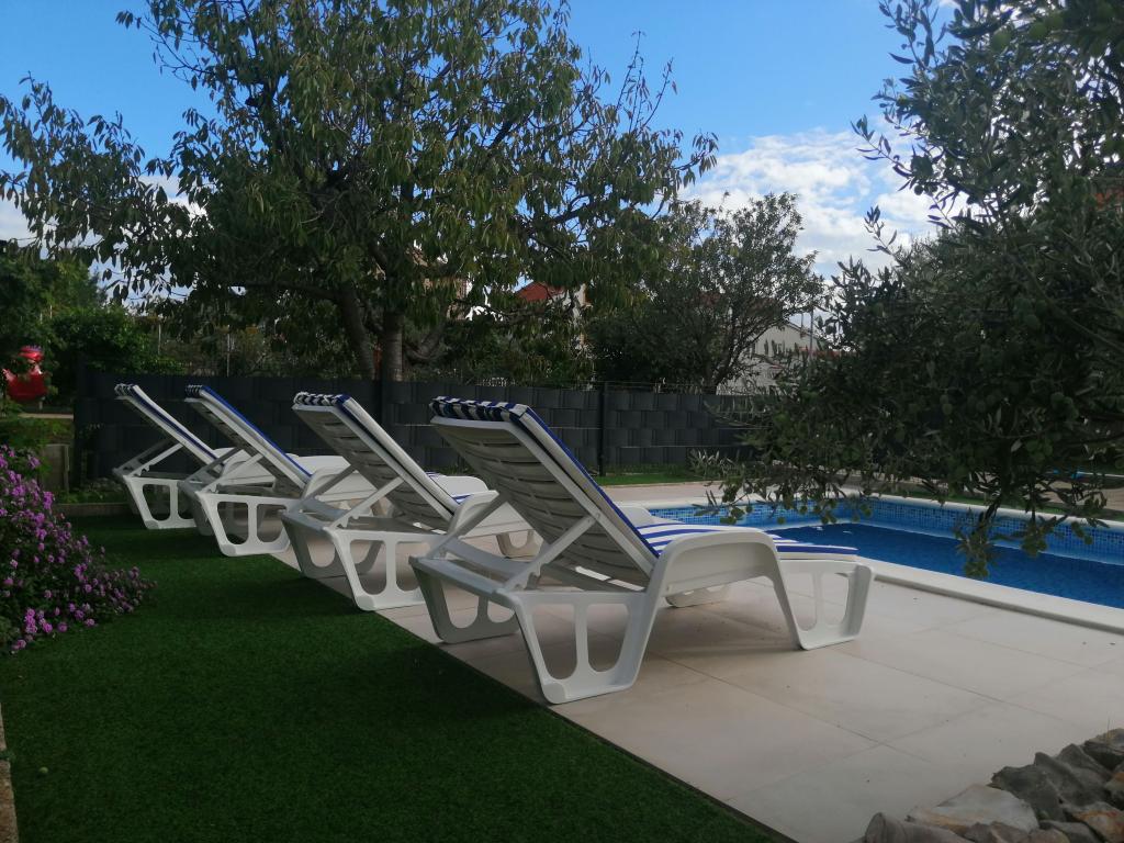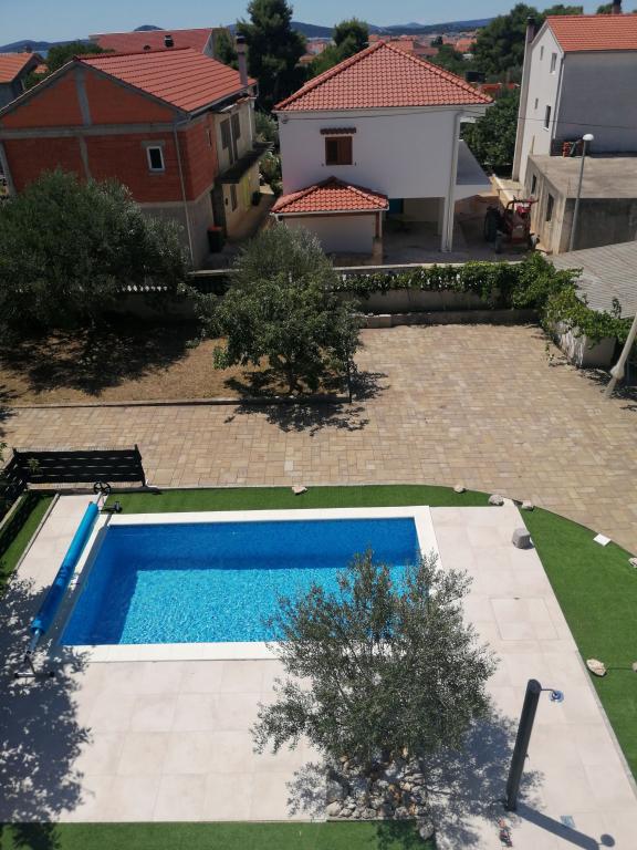 Nowo wyremontowane duże apartamenty z zewnętrznym BASENEM TYLKO DLA CIEBIE!! JAK DOM WAKACYJNY!! Całkowicie NOWO WYREMONTOWANA kuchnia z nowymi urządzeniami (lodówka, zamrażarka, piekarnik, płyta grzewcza, kuchenka mikrofalowa, czajnik, zmywarka, pralka, okap). Naczynia i przybory kuchenne. Salon z narożną sofą, którą w razie potrzeby można rozłożyć na przestronne łóżko. Nowy telewizor z kanałami satelitarnymi. Sypialnie z przestronnymi łóżkami podwójnymi. Pościel. Wszystkie pokoje są klimatyzowane. Dwie łazienki z toaletą i kabinami prysznicowymi, nowo wyremontowane. Pralka, sprzęt do prasowania, suszarka do włosów. Odkurzacz i środki czyszczące, papier toaletowy, mydło, ręczniki. Do dyspozycji Gości jest również taras o powierzchni 30 m2 z meblami ogrodowymi, a także grill, leżaki przy basenie. Ogromny ogród o powierzchni 1300 m2 z mnóstwem śródziemnomorskich drzew. Parking na podwórku BEZPŁATNY!!. Lotniska w Zadarze i Splicie oddalone są o około 60 km. Blisko parków narodowych Krka i Kornati