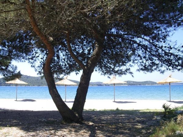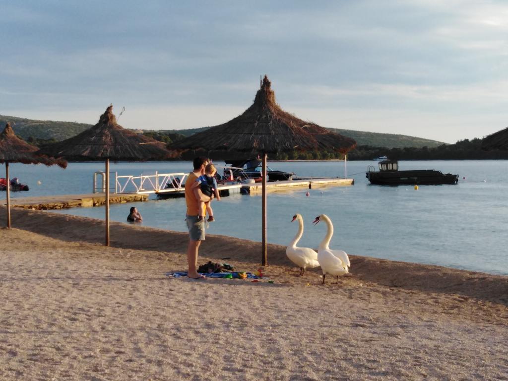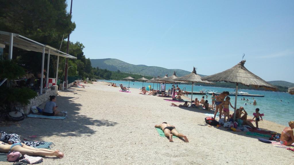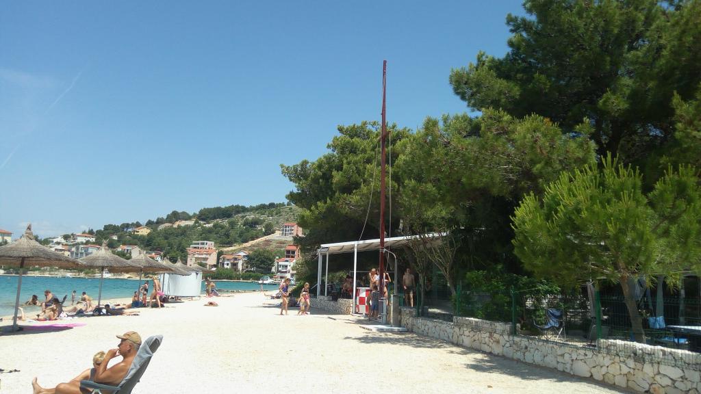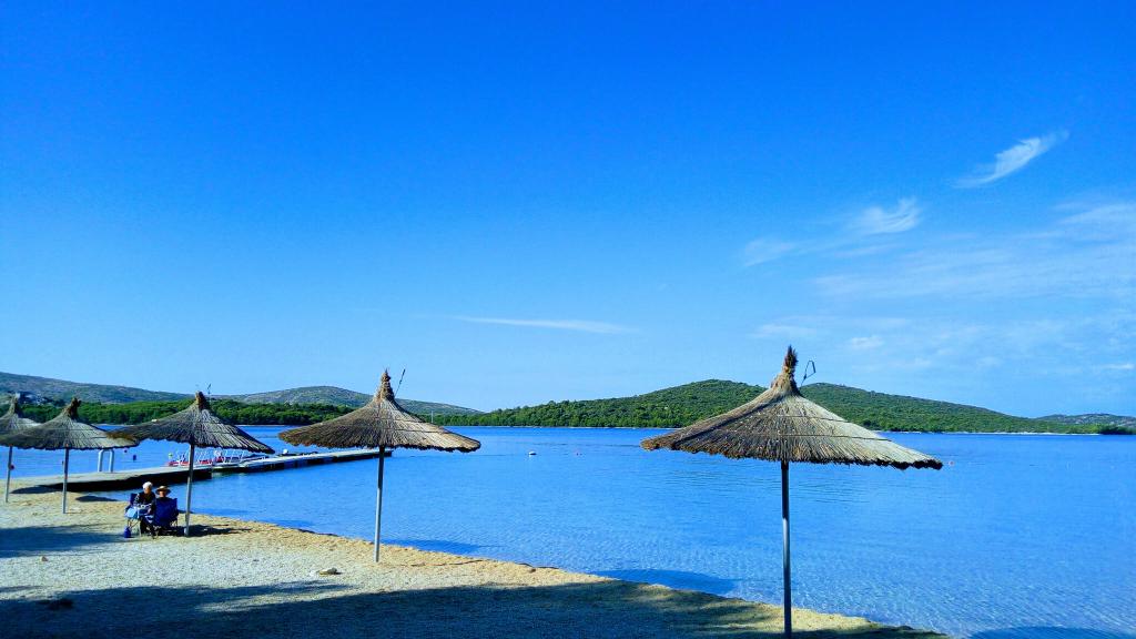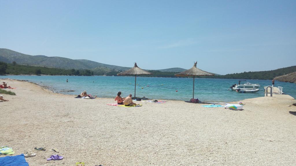 Bardzo spokojna, niezatłoczona, miła plaża wewnątrz zatoki, na którą da się dojechać wózkiem elektrycznym. Lokalizacja tuż nieopodal plaży, bardzo duży apartament na parterze - wyjazd bardzo ciężkim wózkiem elektrycznym przez taras - tylko jeden stopień i próg - mieliśmy własne podjazdy - więc dla nas było OK; ze względu na nasze bardzo nietypowe potrzeby- u nas osoba niepełnosprawna korzystała z ogromnego prysznica na sąsiednim kempingu po drodze z plaży. Apartament w stylu lat 90-tych - może nie najnowszej mody, ale zadbany i bardzo czysty, klima i pełne wyposażenie. A co najważniejsze - JOŠKO - złoty człowiek - niesamowicie życzliwy i pomocny, z którym można bardzo miło pogawedzić, wypić co kto lubi pograć w bilard i ping ponga. JOŠKO - DZIĘKUJEMY !!! POZDRAWIAMY !!! DO ZOBACZENIA !!!