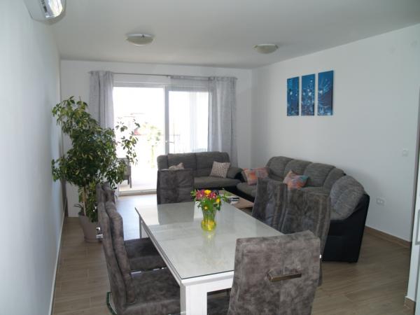 W pełni umeblowane mieszkanie, 3 sypialnie z podwójnymi łóżkami, każdy pokój ma balkon z widokiem na morze. Przestronny pokój dzienny z sofą, kanapa, wyposażone w wygodne kuchnia, łazienka i WC komfortowo. Praking przymocowany do pojazdu. Dzieci są mile widziane. Zabezpieczyć wózek na ziemi.
