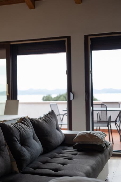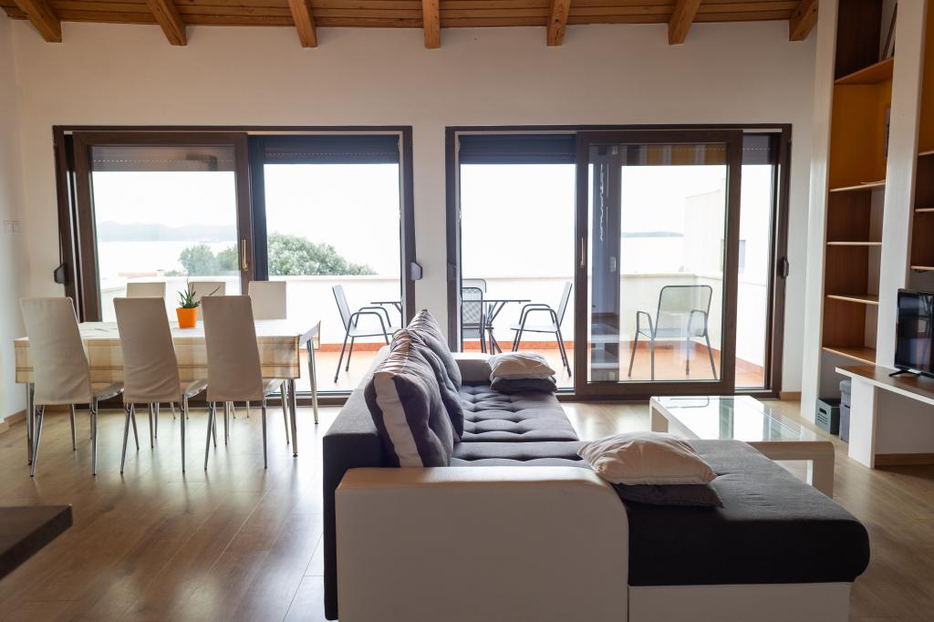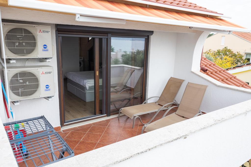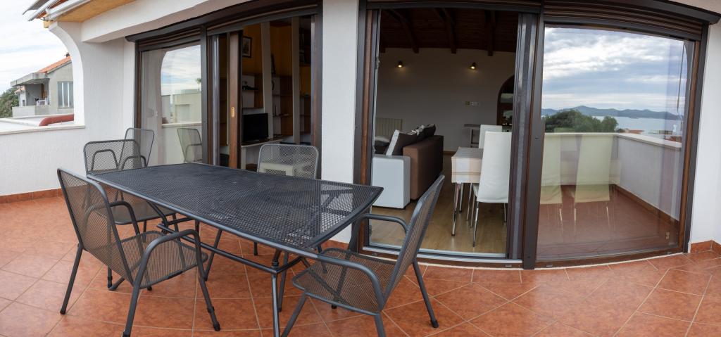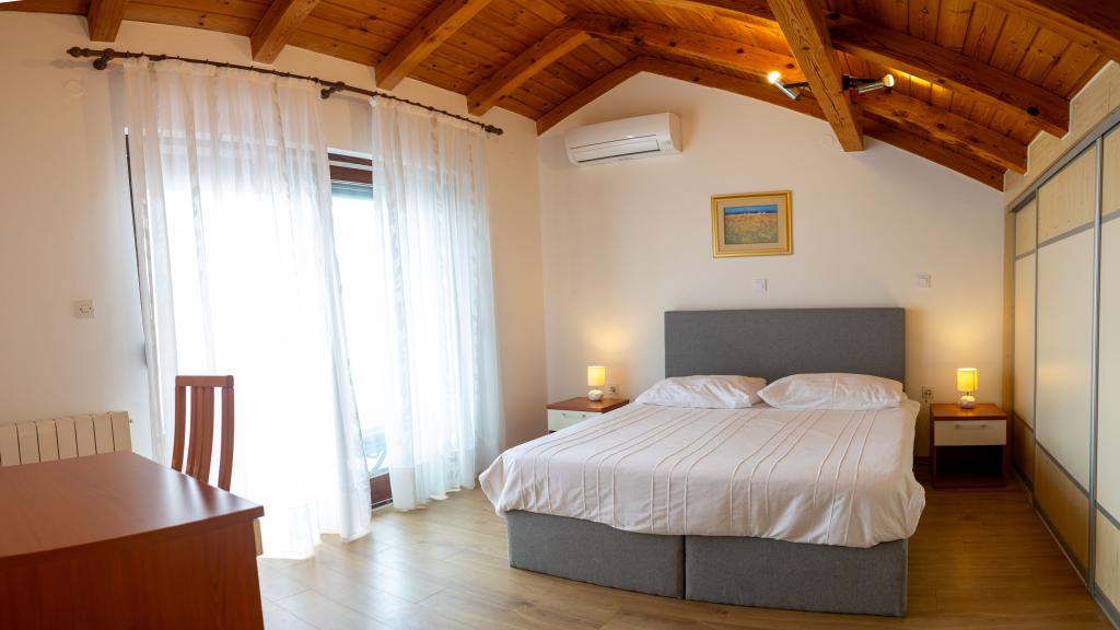 Przestronny, 3-pokojowy apartament (100 m²) na 2. piętrze rustykalnego domu Anica, położonego w spokojnej miejscowości Diklo, zaledwie 6 km od centrum Zadaru i 100 m od morza. Apartament wyposażony jest w duży salon z jadalnią (38 m²) z telewizją satelitarną, klimatyzacją i dostępem do tarasu z widokiem na morze. Dwie wygodne sypialnie oferują elastyczne zakwaterowanie – jedna z łóżkiem podwójnym, druga z łóżkiem pojedynczym i łóżkiem podwójnym oraz prywatnym prysznicem/WC. Obie są klimatyzowane i mają dostęp do tarasu. W pełni wyposażona, otwarta kuchnia obejmuje piekarnik, zmywarkę, płytę ceramiczną, kuchenkę mikrofalową i ekspres do kawy. Do dyspozycji gości jest dodatkowy prysznic/WC i pralka. Trzy tarasy od strony południowej, wyposażone w meble, oferują widok na morze i są idealnym miejscem na relaks. Na terenie posesji znajduje się parking dla dwóch samochodów.