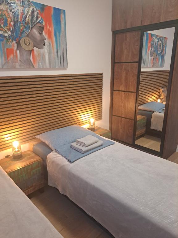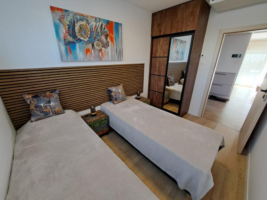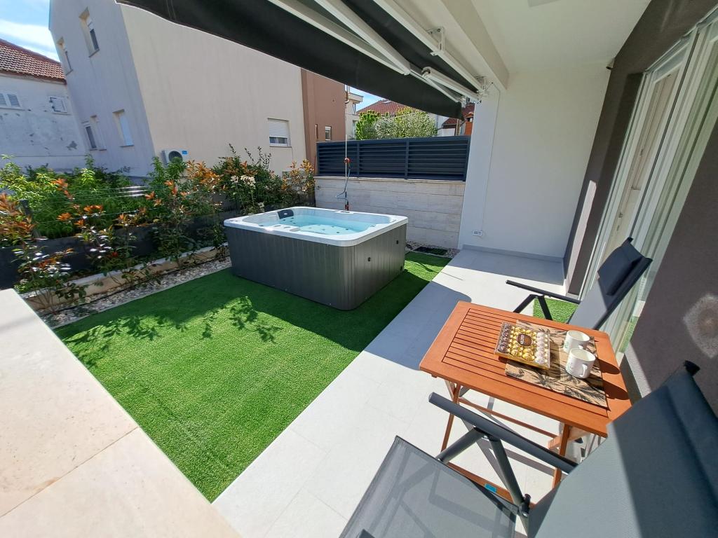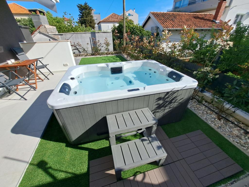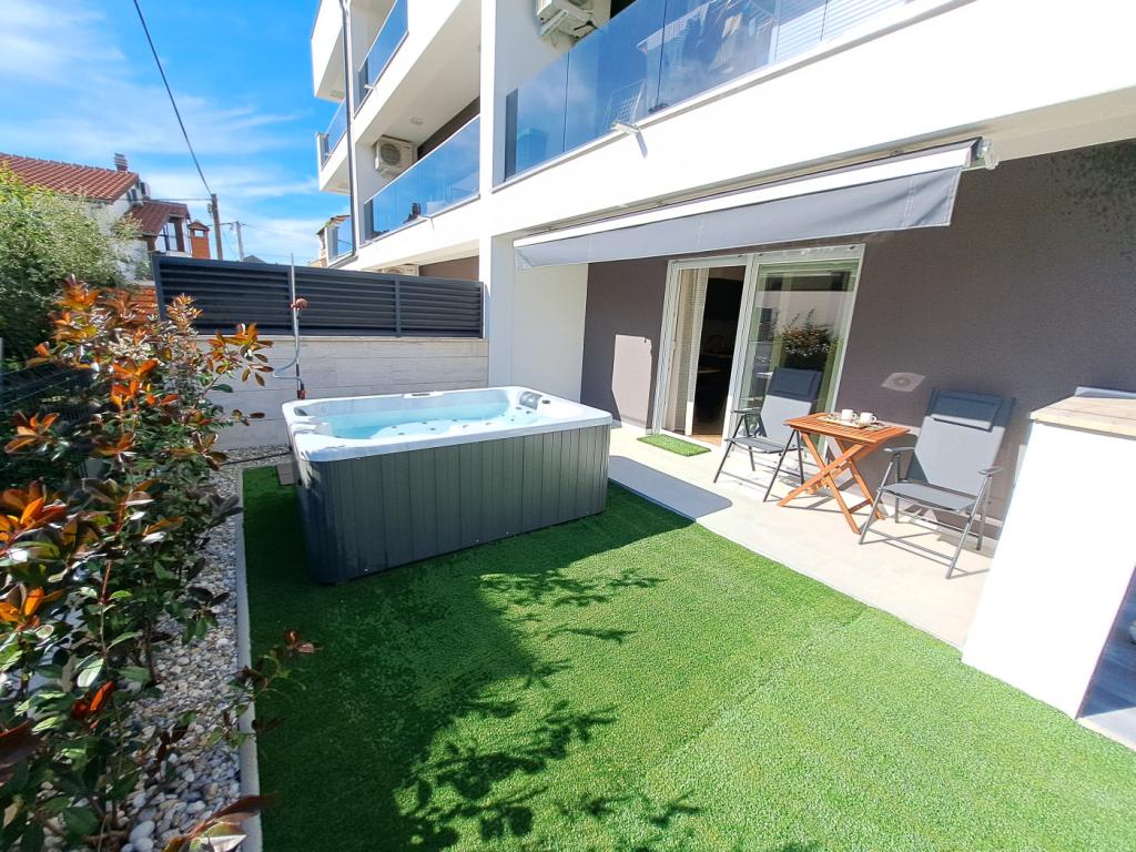 Zwiedzaj! Wypoczywaj! Delektuj się atmosferą Dalmacji! Apartament położony jest na parterze budynku zlokalizowanego w spokojnej zadarskiej dzielnicy Stanovi, do której nie docierają tłumy turystów. W pobliżu (odległość spacerowa) znajdują się sklepy wielobranżowe oraz liczne punkty usługowe- wszystko czego potrzebujesz nawet przy dłuższym pobycie, bez konieczności korzystania z samochodu. Kwatera posiada niezależne wejście z własnego ogródka (ok. 55m2), w którym do dyspozycji gości jest prywatne jacuzzi. Ogródek otoczony jest zielenią. Apartament obejmuje pokój dzienny połączony z kuchnią i aneksem jadalnym, 2 sypialnie (w każdej jedno łóżko dwuosobowe z możliwością rozdzielenia na dwa pojedyncze), łazienkę z prysznicem oraz zadaszoną loggię (ok. 7m2). Część ogrodu z wanną spa można zacienić automatycznie rozsuwaną roletą. Przed budynkiem posiadamy 2 prywatne miejsca parkingowe. Oferujemy również własną stację ładowania samochodów elektrycznych! (opłata dodatkowa)