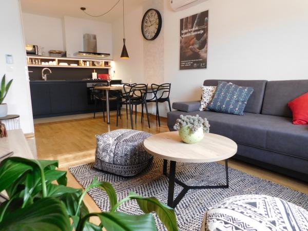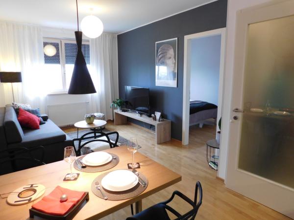 Nowy, nowoczesny apartament na 7. piętrze nowego, właśnie ukończonego budynku, 300 metrów od największej hali sportowej w Chorwacji Arena Arena. Mieszkanie jest w pełni wyposażone. Miejsce parkingowe jest zabezpieczone na parkingu obok budynku (zabezpieczone rampą). Mieszkanie jest wyposażone w cyfrowy zamek i pozwala na całkowite samodzielne przybycie i wyjazd za pomocą jednego kodu wejściowego do budynku (wprowadzonego na domofonie) i innego jednorazowego kodu wejściowego do samego mieszkania. Następnie wchodzisz do mieszkania za pomocą karty inteligentnej. Składa się z przedpokoju, salonu z kuchnią, sypialni i łazienki. Przeznaczony jest dla dwóch osób, a komfortowo i komfortowo może pomieścić do trzech osób. W apartamencie powitają Cię krótkie, proste instrukcje dotyczące inteligentnych zamków i urządzeń (termostat, telewizor, oświetlenie LED w kuchni, zmywarka). W przypadku wszystkich pytań pomoc jest dostępna przez 24 godziny.