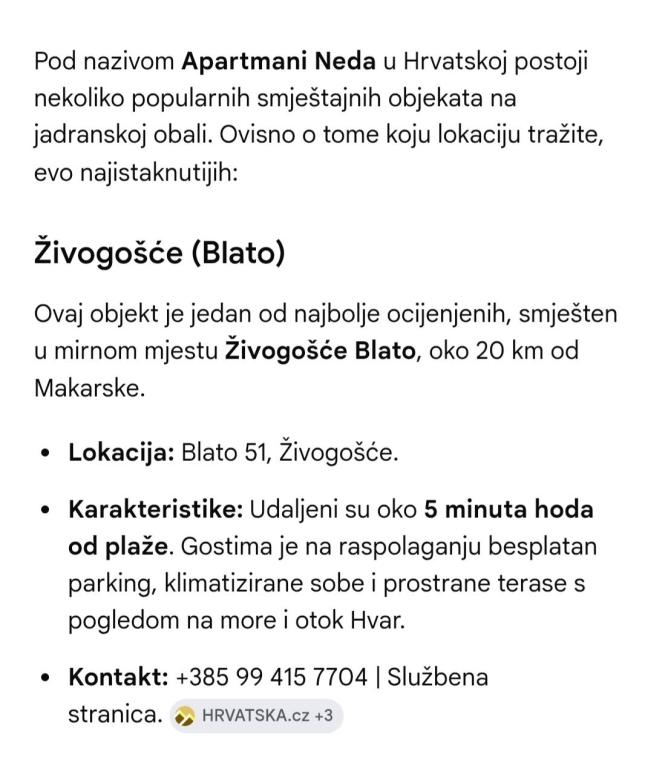 Apartamenty NEDA znajdują się w spokojnej miejscowości Živogošće Blato, która znajduje się 20 km na południe od Makarskiej. Czyste morze, gęsty las sosnowy i gaje oliwne, kilometry połączonych ze sobą plaż, pomiędzy którymi kryją się liczne zatoczki, to tylko część naturalnego piękna tego regionu, nadająca turystom wyjątkową atmosferę i przyjemność pobytu. Z naszych przestronnych tarasów roztacza się widok na morze i wyspy oraz na drugą stronę góry Biokovo. Parking znajduje się obok obiektu. Chętnie poczęstujemy Państwa różnego rodzaju domowymi brandy i likierami, które sami przyrządzamy. AKCEPTUJEMY ZWIERZĘTA TYLKO NA ZAMÓWIENIE..