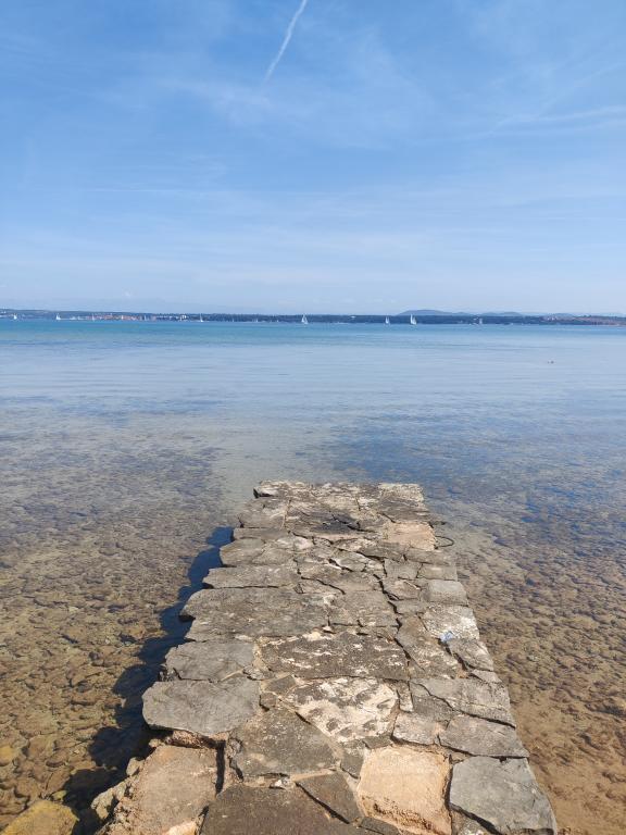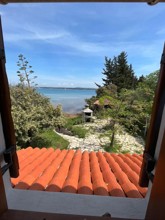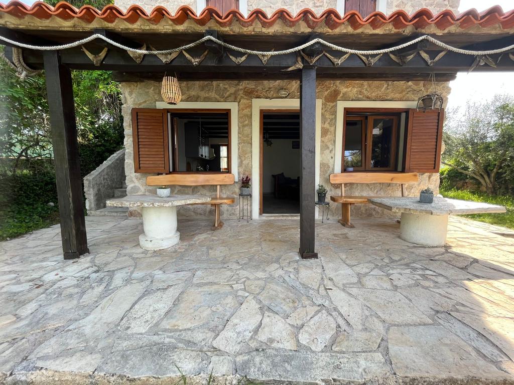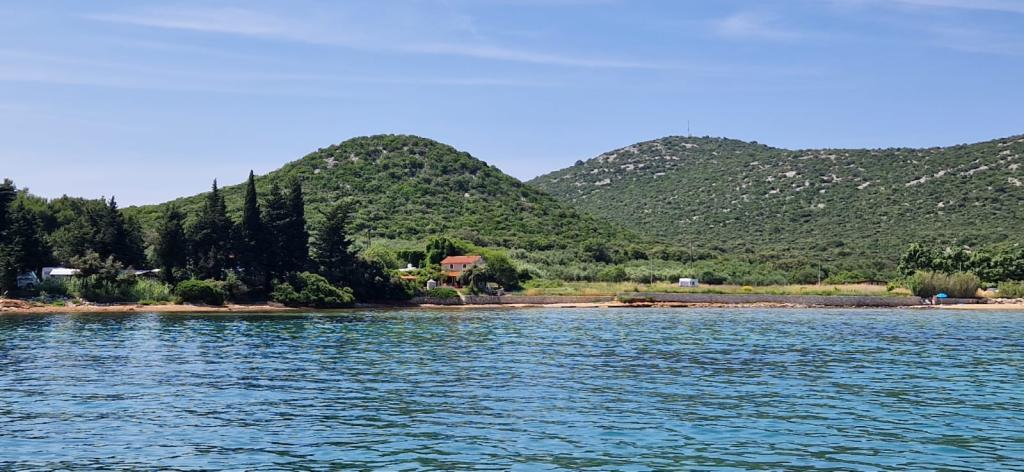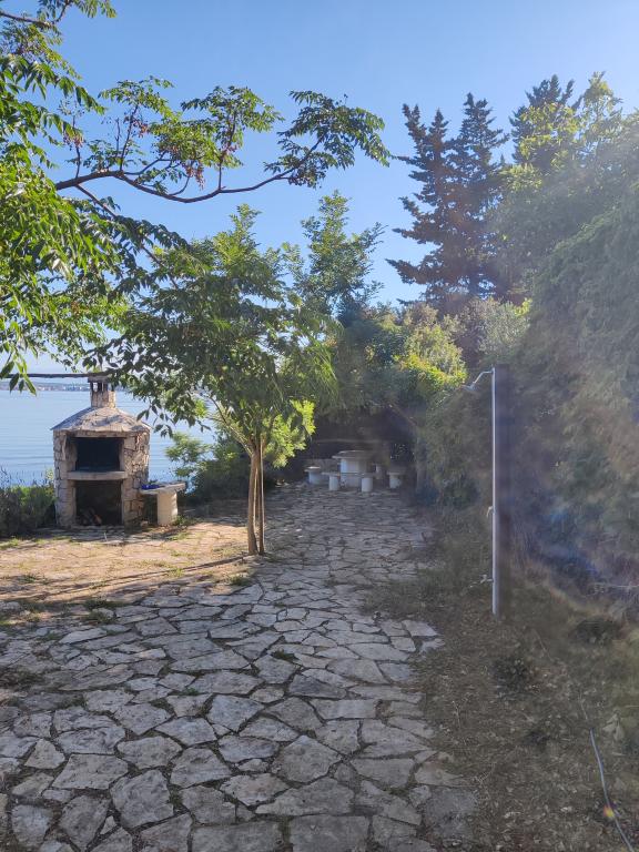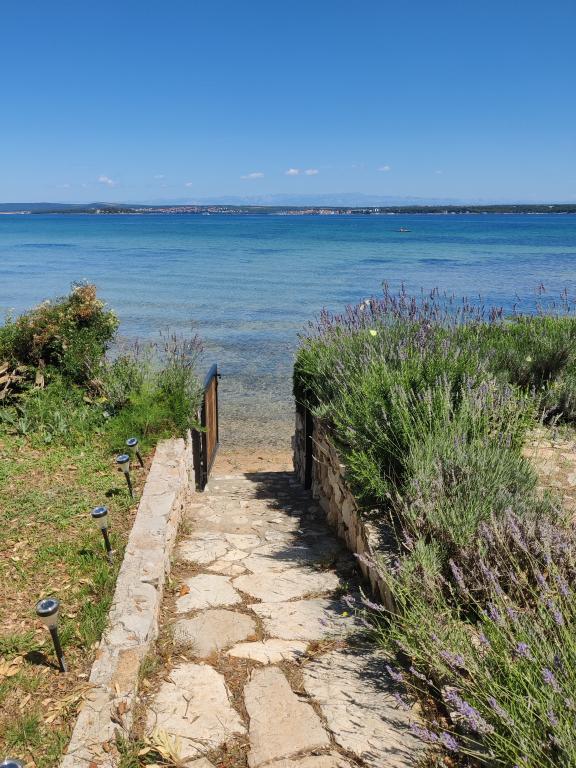 Dom położony jest na południe od centrum miejscowości Tkon na wyspie Pašman, tuż przy drodze. Można wjechać przez bramę i zaparkować samochód tuż obok domu. Obok domu znajduje się kemping dla nudystów, ukryty przed wzrokiem pnączy. Pierwszy budynek po drugiej stronie jest oddalony o 50 metrów. Dom znajduje się 10 metrów od morza i piaszczystej plaży. Głębokość morza wynosi około pół metra, a dno jest piaszczyste, co jest idealne dla dzieci. Przed domem znajduje się zadaszony, drewniany taras ze stołem i ławkami, gdzie można cieszyć się cieniem i zjeść lunch, a tuż obok znajduje się kamienny grill. Przed domem znajduje się również zadaszenie zapewniające cień. Na tarasie znajduje się prysznic na świeżym powietrzu.