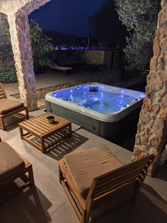 Piękne, naturalne i spokojne miejsce. Dom z jacuzzi do wynajęcia na wyspie Drvenik Mali, około 150 metrów od morza. Dom składa się z dwóch sypialni, salonu z kuchnią i jadalnią oraz łazienki. Najpiękniejszą częścią domu jest taras z kominkiem i kamiennym grillem. Drvenik Mali, wyspa otoczona czystymi wodami Adriatyku, leży w pobliżu Trogiru i Splitu. Połączony jest małym promem, który kursuje cztery razy dziennie w sezonie. Drvenik Mali to bardzo spokojna wyspa, pełna spokoju, wyjątkowego piękna przyrody i wyjątkowo czystego morza. To idealne miejsce na wakacje „z dala od miejskiego zgiełku” i prawdziwe wyzwanie dla każdego współczesnego Robinsona. Jeśli szukasz bujnej śródziemnomorskiej roślinności, oryginalnej atmosfery i autentycznego wyspiarskiego klimatu, Drvenik Mali to idealny wybór dla Ciebie.