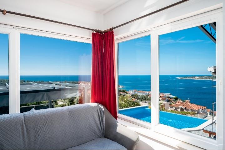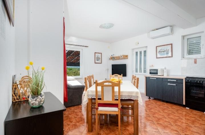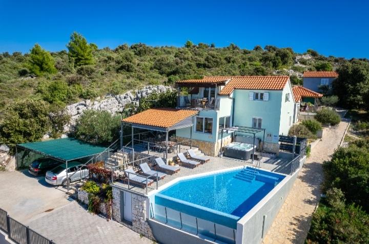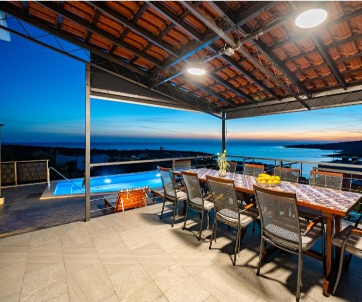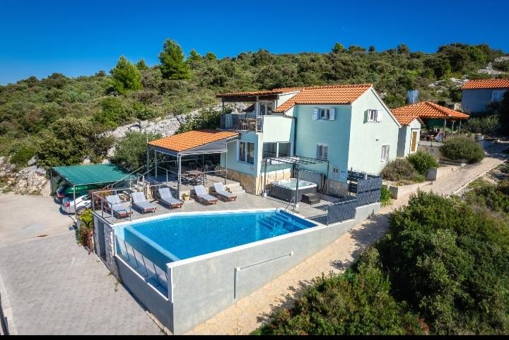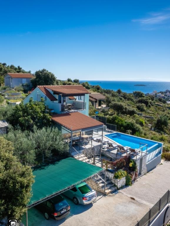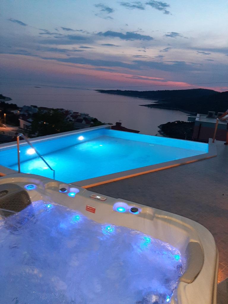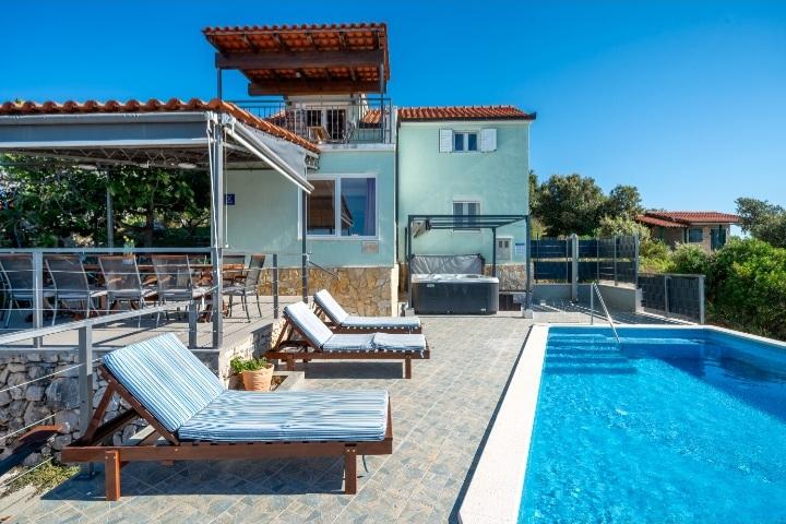 Dom wakacyjny z basenem i podgrzewaną wanną do masażu położony jest na wzgórzu z pięknym widokiem na otwarte morze. Jest idealnym miejscem na spokojny wypoczynek dla dużej rodziny lub grupy przyjaciół. Jednocześnie łatwo dostępne są obiekty sportowe i rozrywkowe; zagospodarowane ścieżki rowerowe, piaszczyste, betonowe i żwirowe plaże nad krystalicznie czystym morzem. Restauracje i kluby nocne oddalone są od obiektu o 5–10 minut jazdy samochodem. W domu znajduje się łącznie dziesięć łóżek i dwie rozkładane sofy, dwie nowoczesne kuchnie, dwie łazienki i dwie toalety. Kuchnie wyposażone są w naczynia do przygotowania i przybory do serwowania posiłków. W jednej kuchni znajduje się zmywarka, ekspres do kawy, kuchenka mikrofalowa, czajnik, toster. Do dyspozycji gości dwa zadaszone tarasy, duży otwarty taras przy basenie, grill, parking na trzy samochody, basen (40 m2), leżaki, prysznic na świeżym powietrzu oraz ogrodzony plac zabaw dla dzieci. Sprzątanie końcowe, klimatyzacja, konserwacja basenu, opłata klimatyczna i internet są wliczone w cenę. Powitanie!