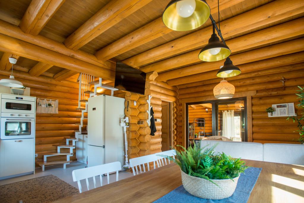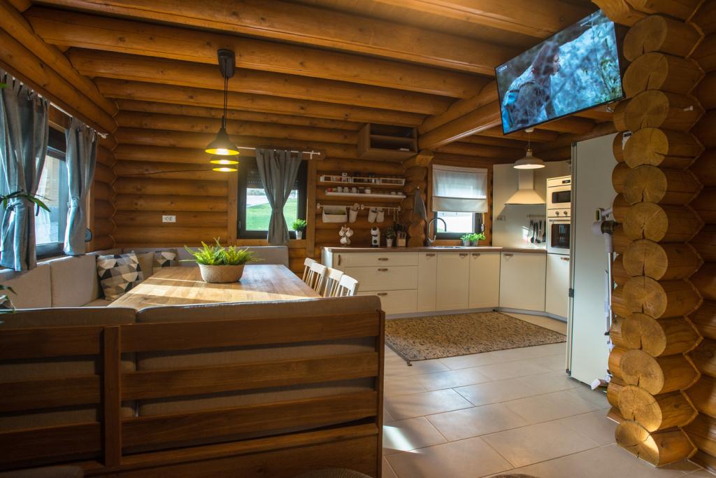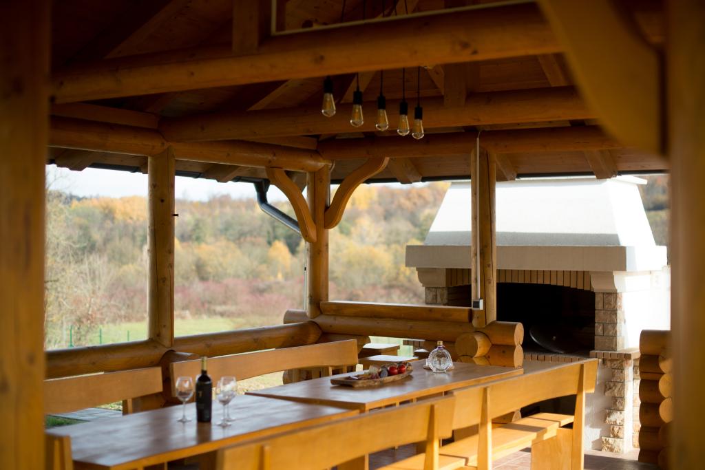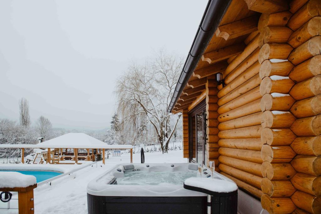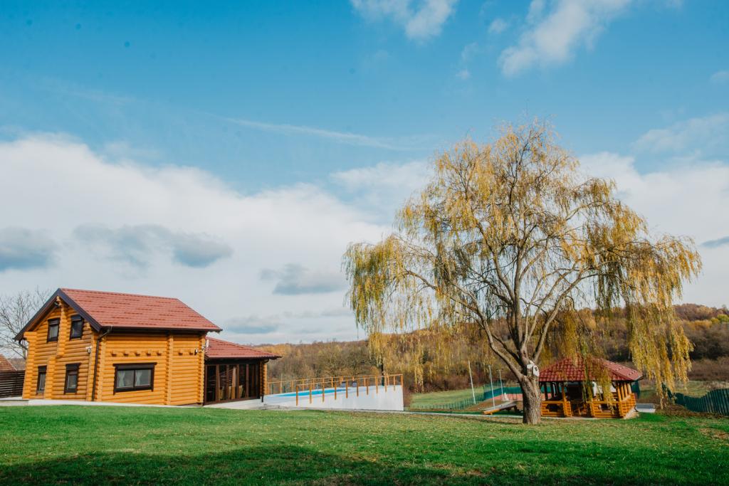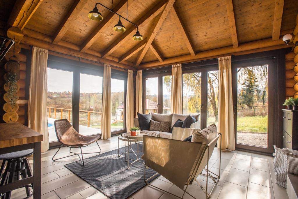 Drewniany dom z sosny syberyjskiej. Dom: maksymalnie nie. łóżek 10, dom 108 m2, taras z basenem 105 m2, sauna, jacuzzi, altanka 30 m2. ogród ponad 7000 m2, parking, salon z kuchnią, 3 sypialnie, łazienka z prysznicem i WC. Zamykany taras z kominkiem, kort tenisowy do spotkań towarzyskich i sportowych, przebieralnia z prysznicem i toaletą, altana z grillem, wędką i niezbędnym wyposażeniem. Plac zabaw dla dzieci, 4 telewizory, rzutki.