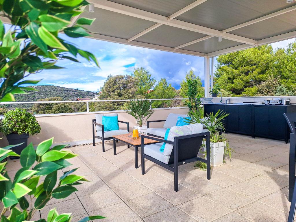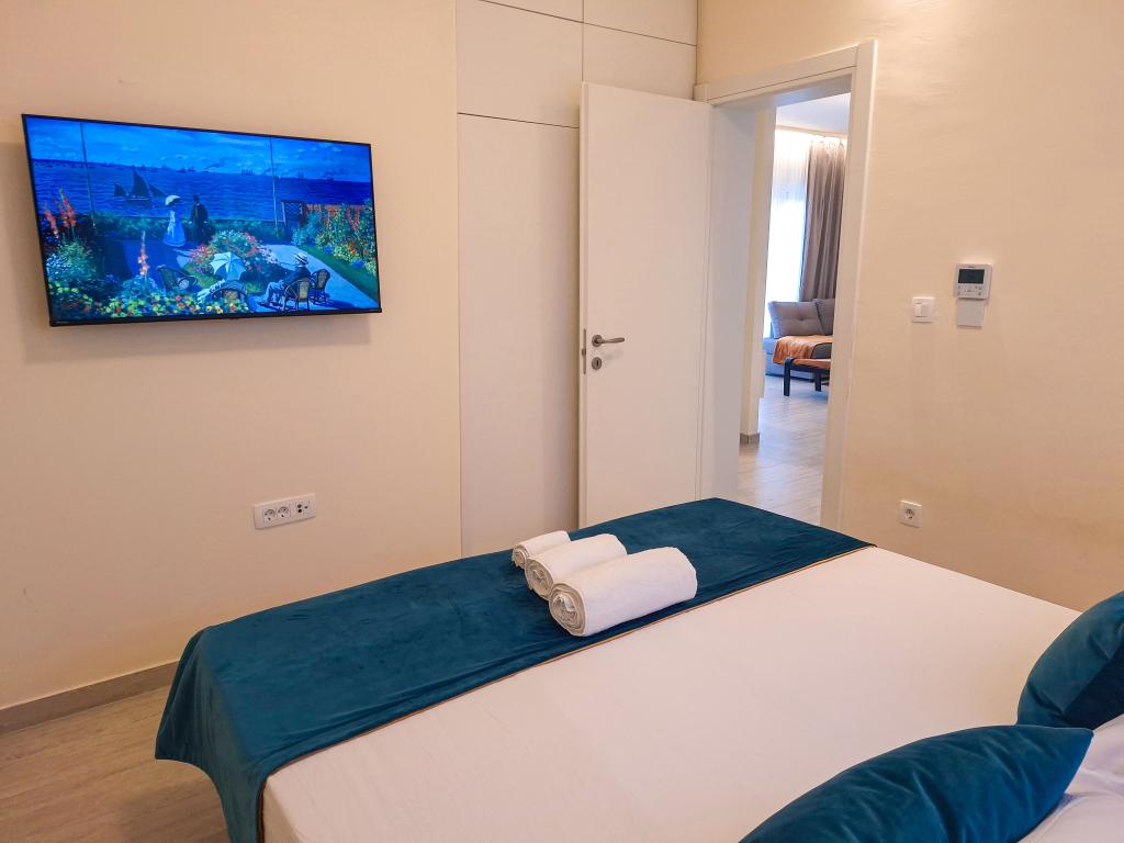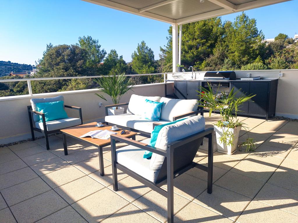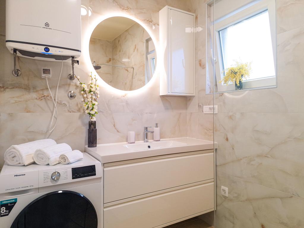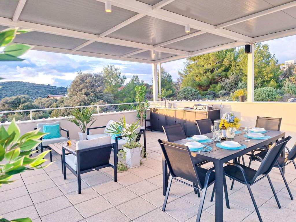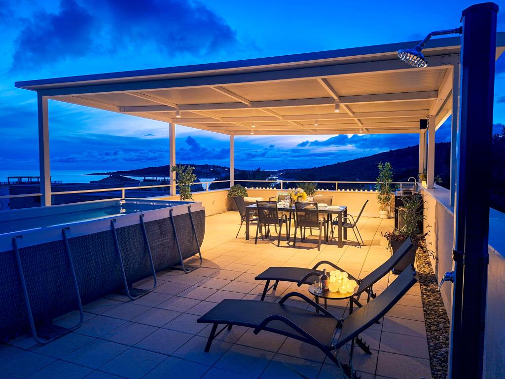 Witamy w Tesa, nowej, nowoczesnej willi, gdzie możesz w pełni cieszyć się czasem spędzonym z rodziną lub przyjaciółmi. Ta elegancka willa, która pomieści maksymalnie 6 osób, oferuje w pełni wyposażoną kuchnię, nowoczesną łazienkę z kabiną prysznicową i pralko-suszarką, a także klimatyzację i telewizor w każdym pokoju. Taras na dachu z widokiem na morze i wyspy oferuje podgrzewany basen, zewnętrzny prysznic i leżaki, idealne do relaksu w ciągu dnia przy ulubionej książce lub muzyce z głośników, a wieczorem do relaksu pod gwiazdami przy kieliszku ulubionego drinka. Taras z w pełni wyposażoną kuchnią (grill, kuchenka, lodówka), stołem jadalnym i częścią wypoczynkową daje możliwość spędzenia całego dnia na świeżym powietrzu. Gotowanie w przyjemnej morskiej bryzie sprawi, że to doświadczenie będzie niezwykle przyjemne. Idealna, centralna lokalizacja ze wszystkimi niezbędnymi udogodnieniami i pięknymi plażami oddalonymi o zaledwie 200 metrów, w otoczeniu zieleni i pięknie zagospodarowanego ogrodu stworzonego do relaksu, zapewnią Ci niezapomniane wakacje.