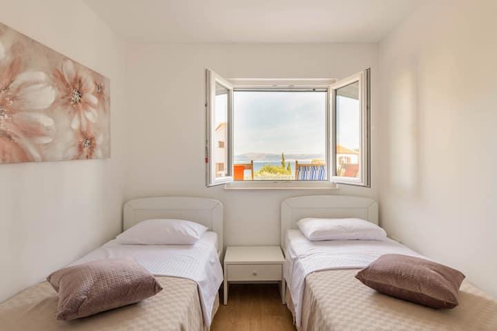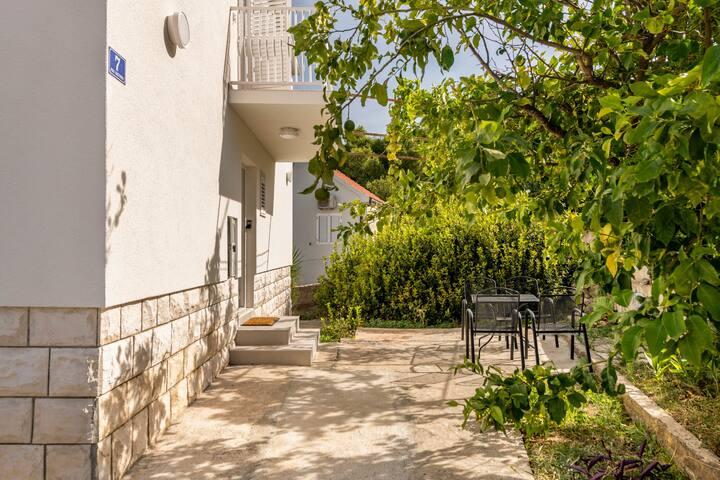 Nowo wyremontowany dom wakacyjny w centrum Sutivan, kilka minut od plaży z pięknym widokiem na morze. Dom ogrodowy Sutivan położony jest na działce o powierzchni 800m2 z przestronnym śródziemnomorskim ogrodem i może pomieścić 8+1 gości w 4 sypialniach. Na parterze dominuje duży otwarty salon/jadalnia z kominkiem na chłodniejsze noce oraz w pełni wyposażona kuchnia z piekarnikiem i zmywarką. Z salonu wyjście na odkryty taras jadalny z widokiem na morze i leżakami. Na tym samym piętrze znajduje się sypialnia z dwoma oddzielnymi łóżkami oraz łazienka z prysznicem. Schody prowadzą na piętro, na którym znajdują się trzy sypialnie (dwie z podwójnymi łóżkami i balkonem, jedna z dwoma pojedynczymi łóżkami) i dwie łazienki. W piwnicy znajduje się stół do gry w piłkarzyki i konsola oraz dodatkowa łazienka z pralką. Parking na dwa samochody tuż przy wejściu do domu, na zewnątrz znajduje się tradycyjny grill z dodatkowym stołem i krzesłami. W ogrodzie rosną drzewa oliwne i duże drzewo figowe, dostęp do plaży przez ogród.