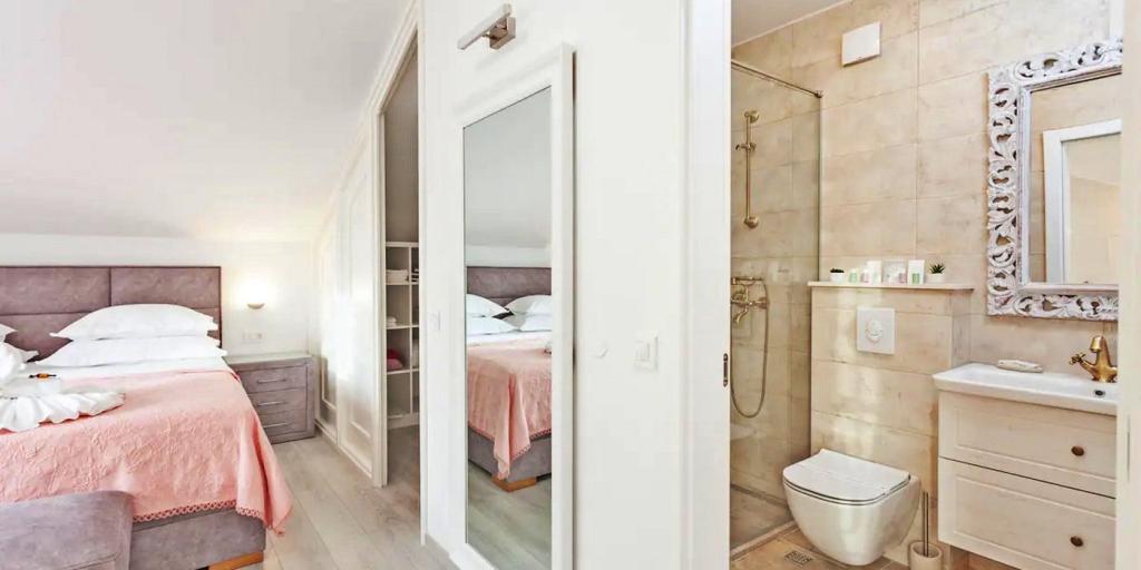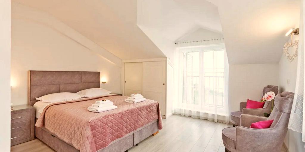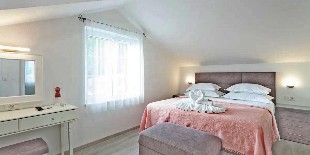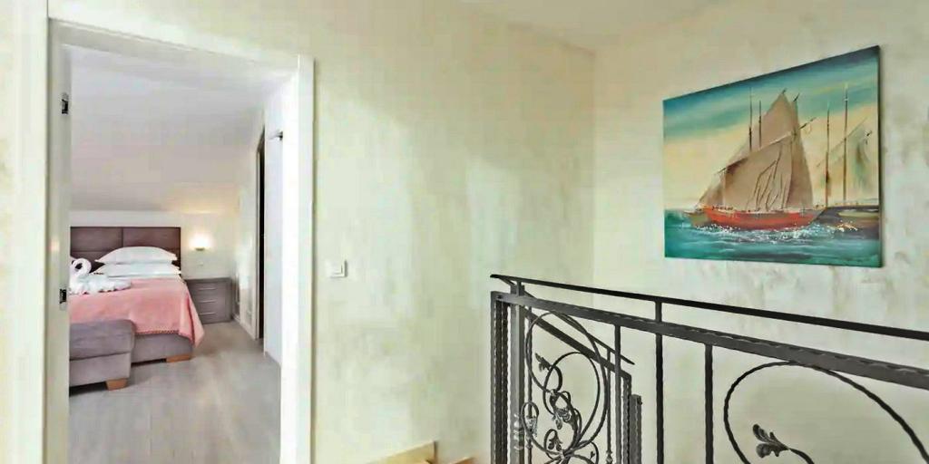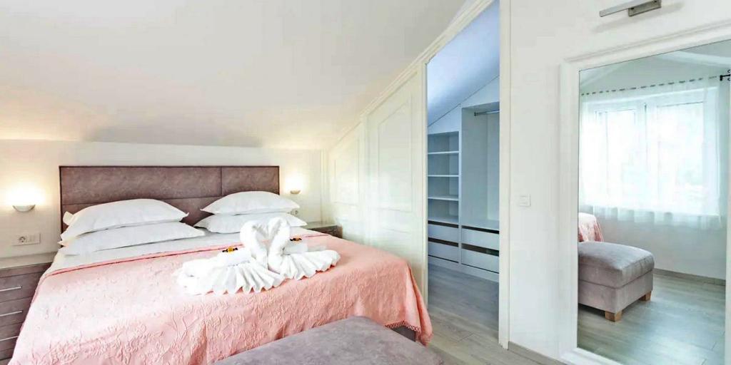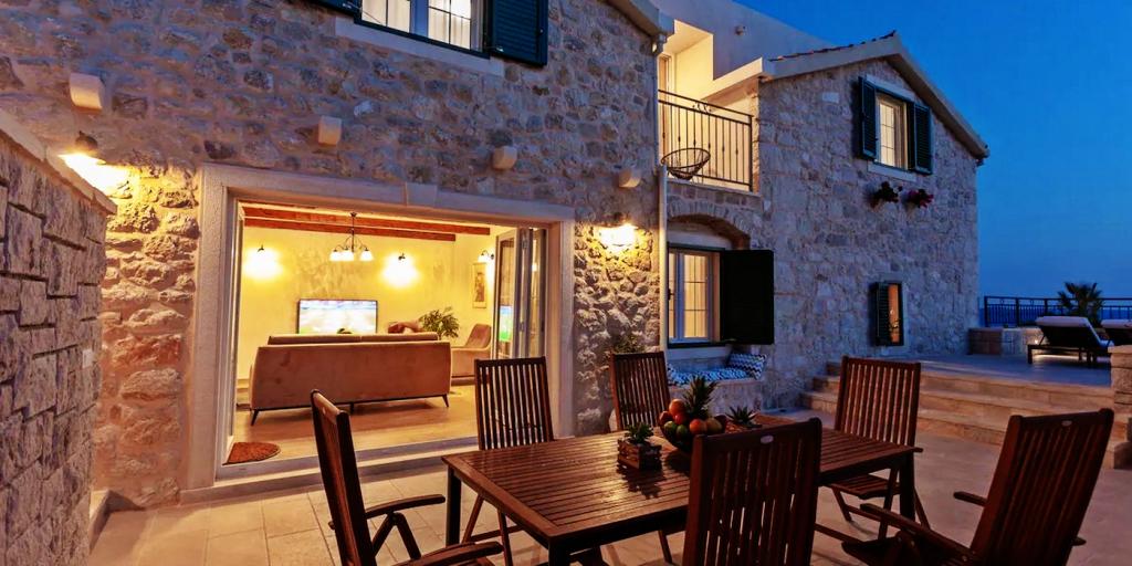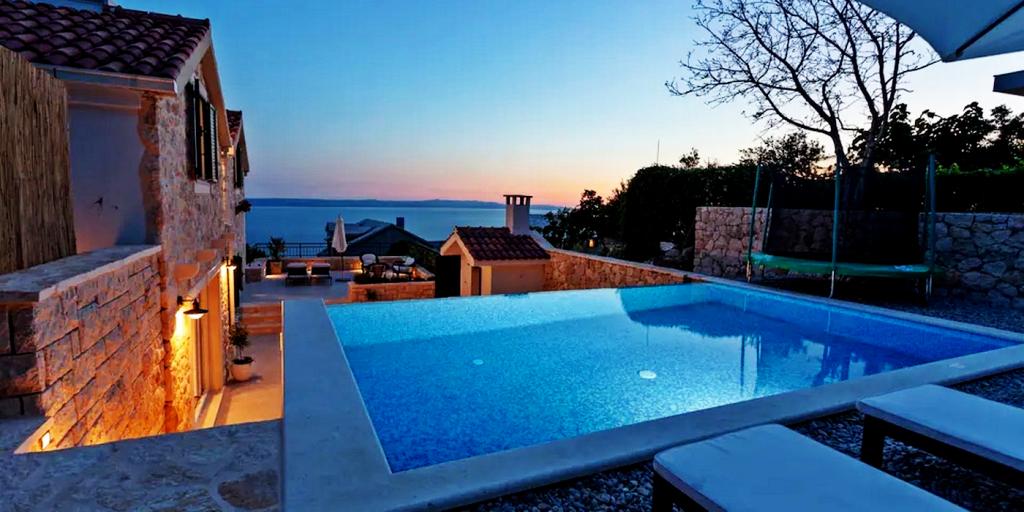 Dom składa się z dwóch przestronnych pokoi z prywatną łazienką w każdym pokoju. Mogą w nich spać 4 osoby, a w razie potrzeby można dostawić 1 dodatkowe łóżko dla jednej osoby. Wyposażony we wszystkie niezbędne sprzęty elektroniczne (zmywarka, pralka, TV w każdym pokoju, wifi), przestronną kuchnię, salon, a także grill zewnętrzny, gdzie możesz przygotować najpiękniejsze przysmaki ze świeżych ryb lub mięsa dla swoich bliskich. Dom posiada basen z plażą, gdzie można odpocząć od miejskiego zgiełku. Znajdują się tam również dwa duże tarasy z miejscami do siedzenia na dwóch piętrach, z których najwyższy oferuje widok na wyspy i morze, tak jakby trzymał je w dłoni. Dom oferuje również 2 zadaszone miejsca parkingowe. Obok domu znajduje się szlak przyrodniczy Parku Biokovo. Jedna z wielu ścieżek pr